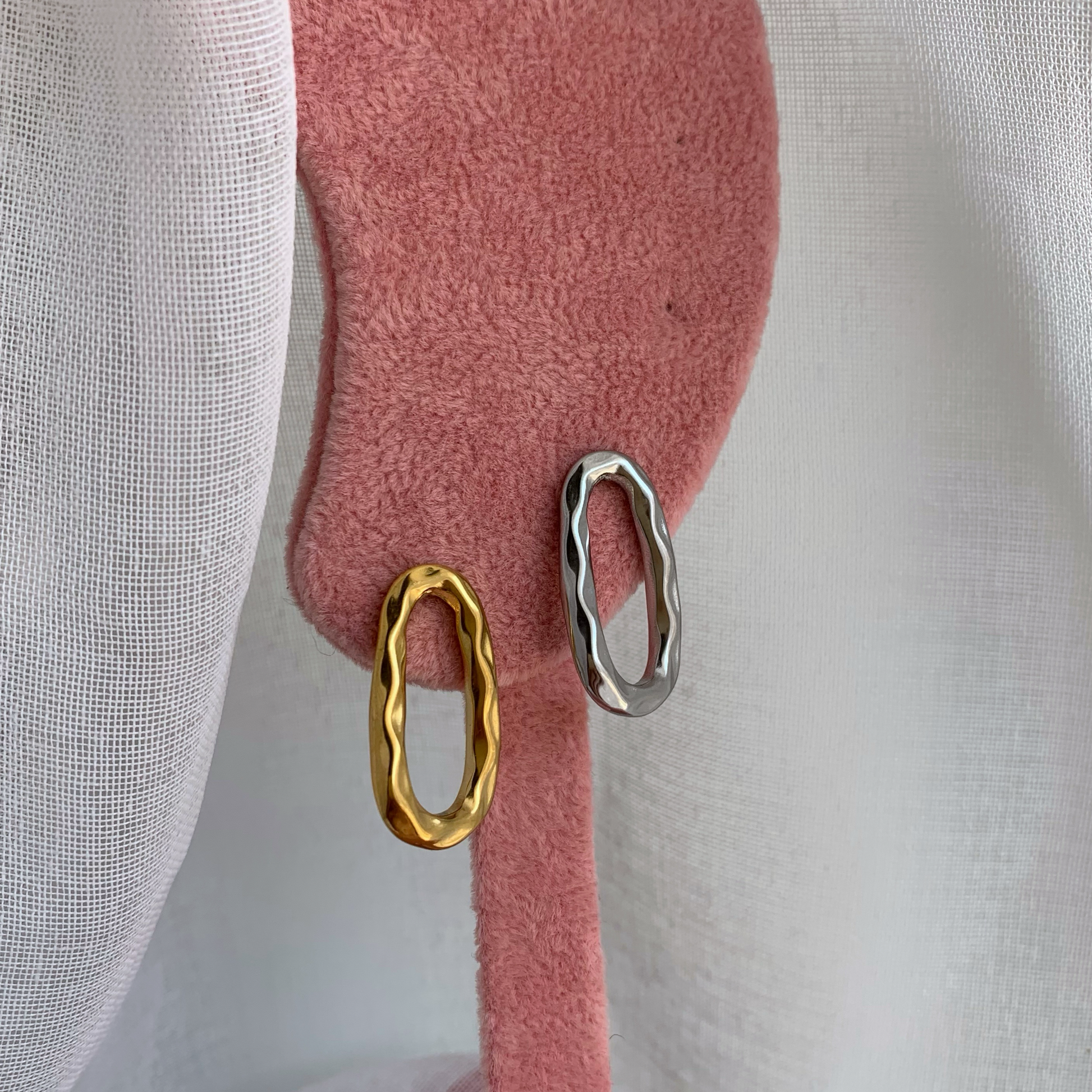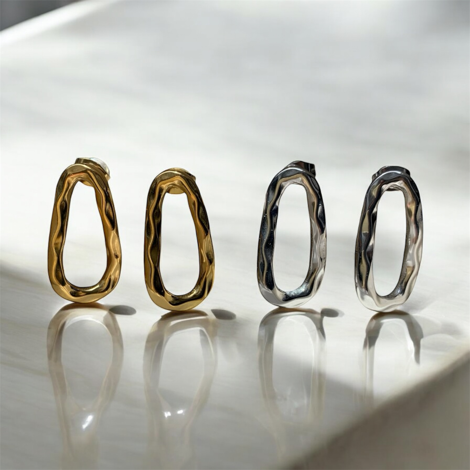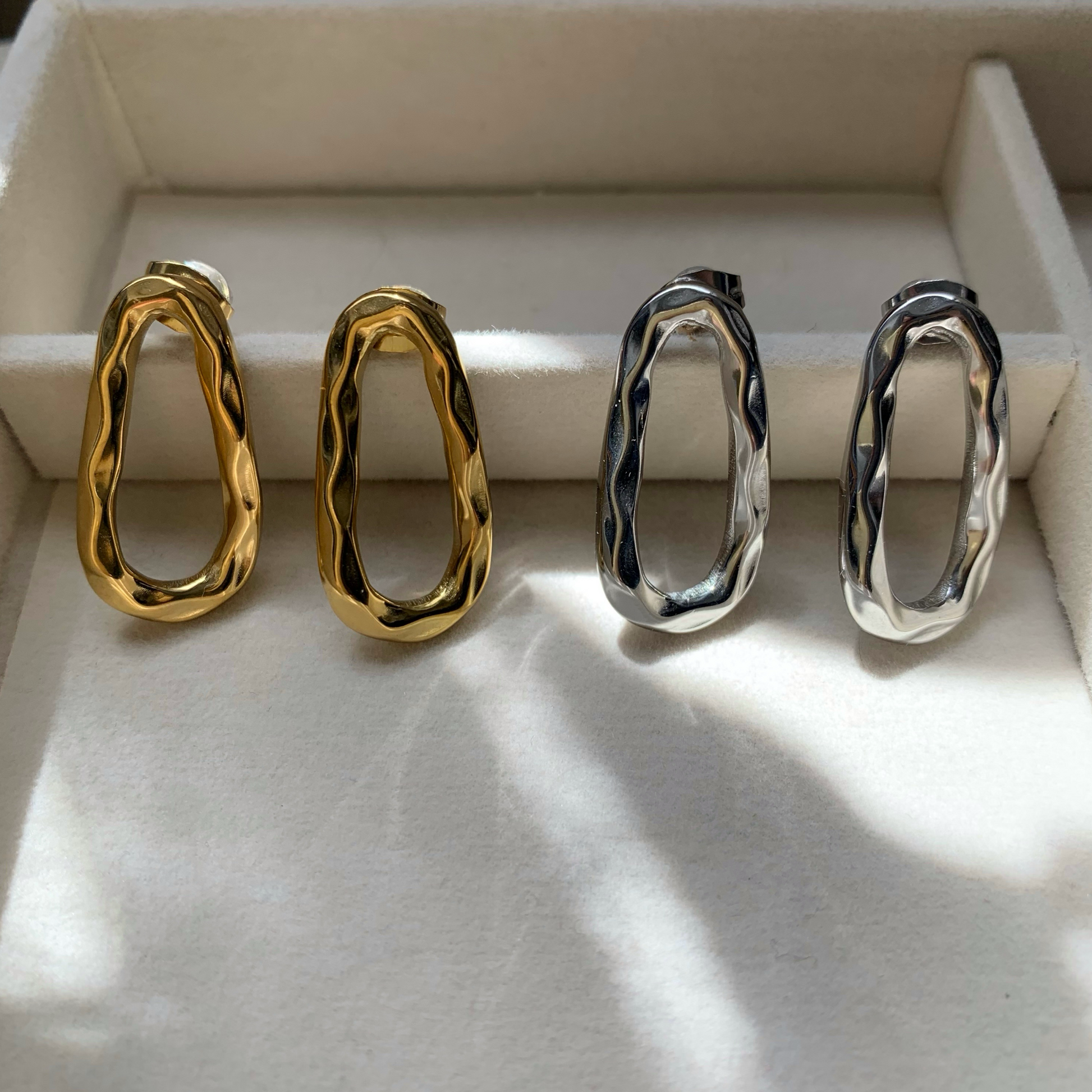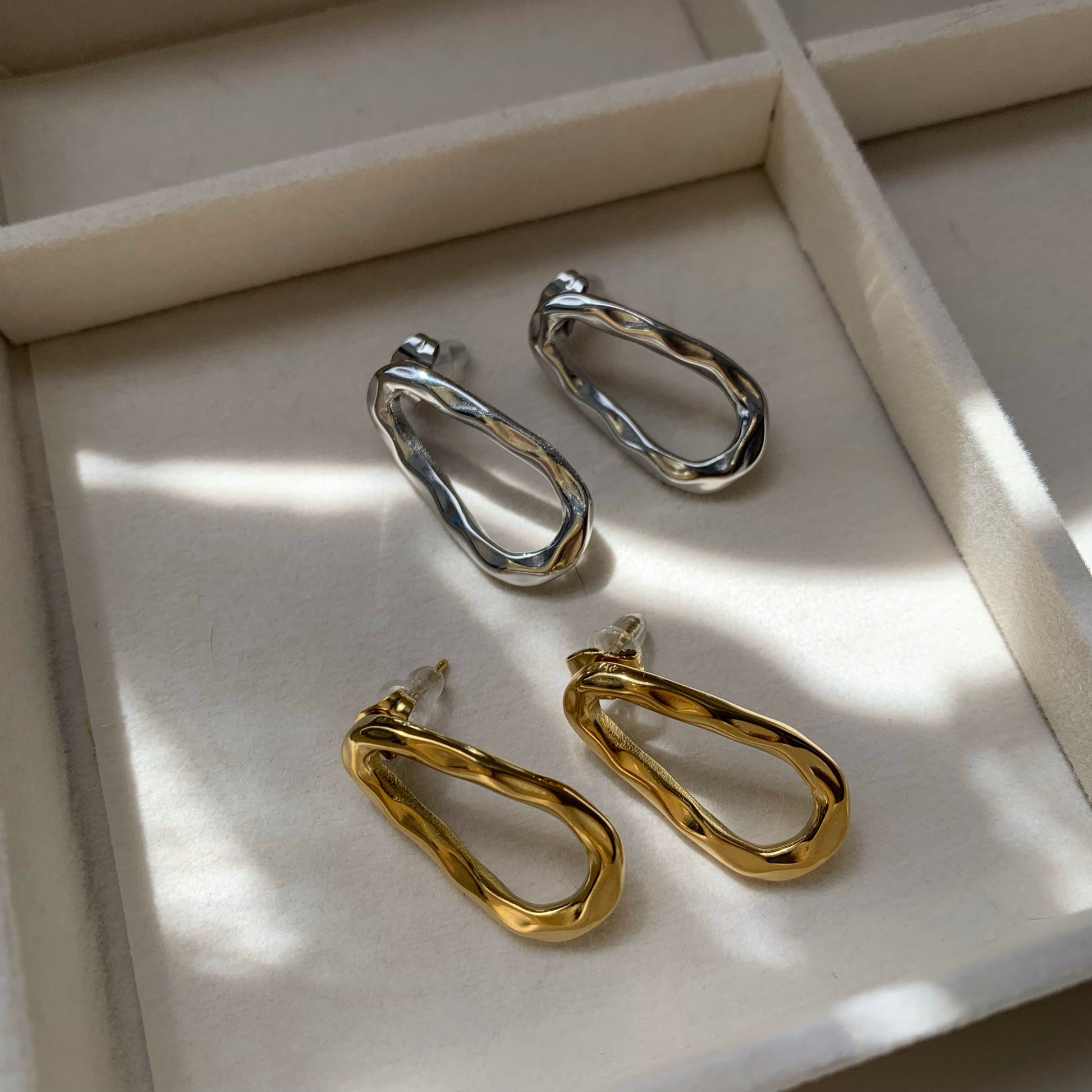 Coppia di orecchini a forma di goccia vuota all'interno, chiusura con comoda farfallina. Disponibili nella versione dorata o argentata.