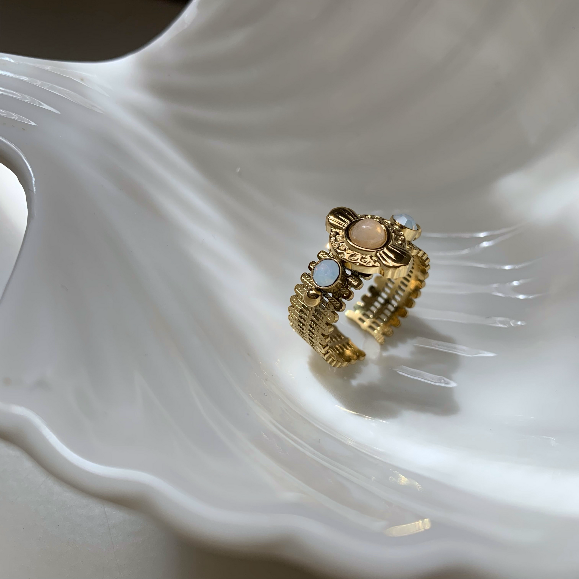 Anello regolabile a fascia lavorazione intarsiata, con applicazioni di zirconi e pietre (bianco latte e rosa pallido) che evoca lo stile Boho, uno stile inconfondibile che mixa forme e materiali diversi. La caratteristica dello stile Boho è indossare più anelli insieme anche di diverse forme o stili. Uno stile contemporaneo che lascia spazio alla fantasia!