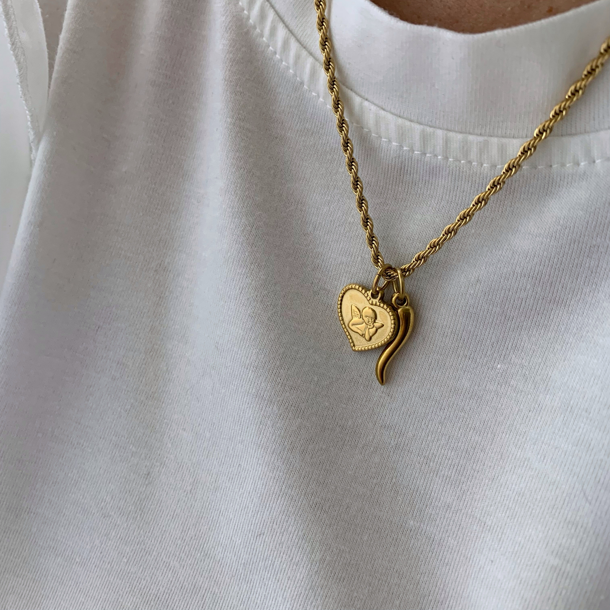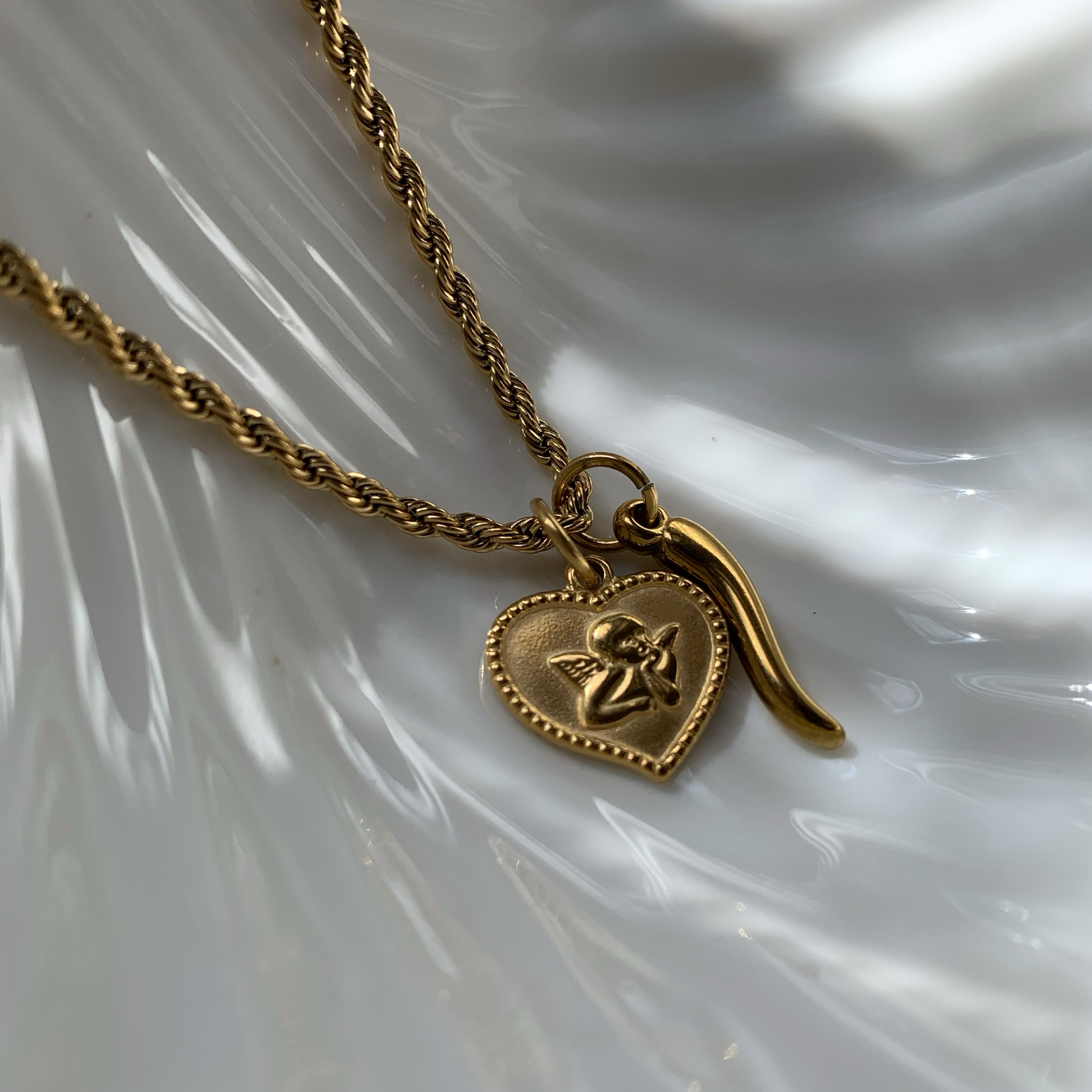 Collana maglia torchon spessore di 2 mm con 2 ciondoli inclusi: corno dorato e cuore con angioletto.