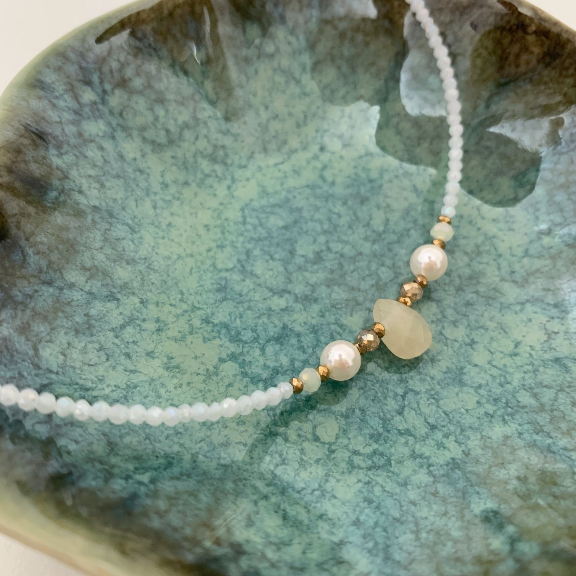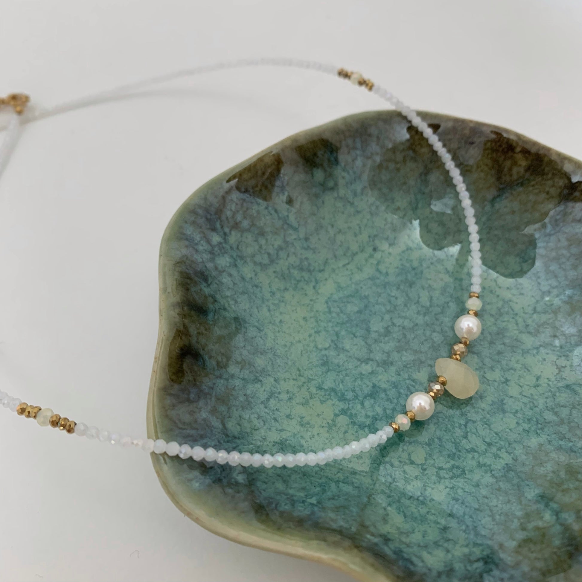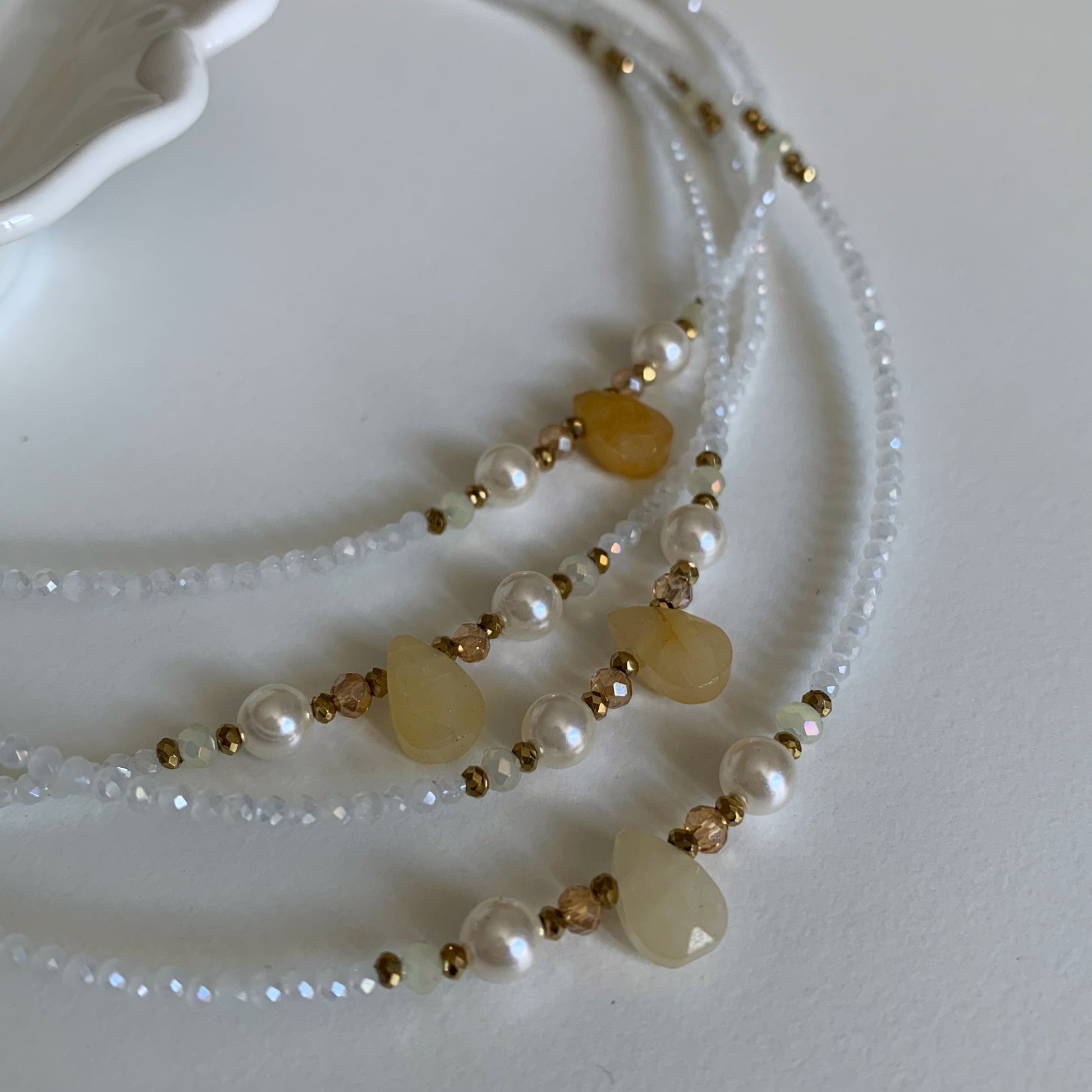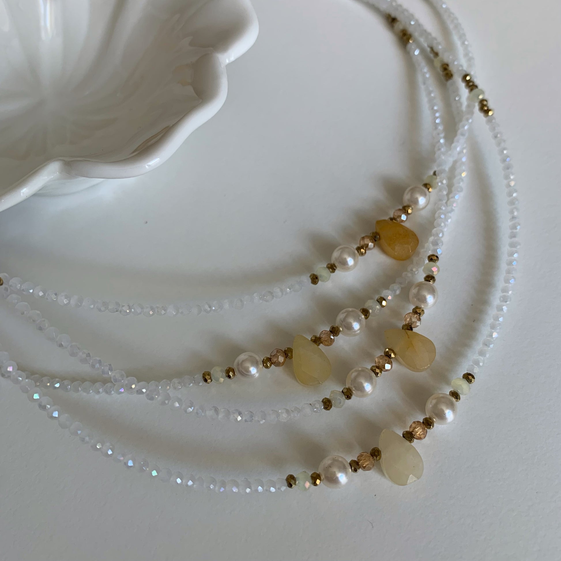 Le pietre in vetro, scelte per la loro brillantezza e purezza, sono montate a mano su un filo resistente e delicato. Il design semplice ma d’effetto valorizza la lucentezza del bianco, evocando purezza e raffinatezza.