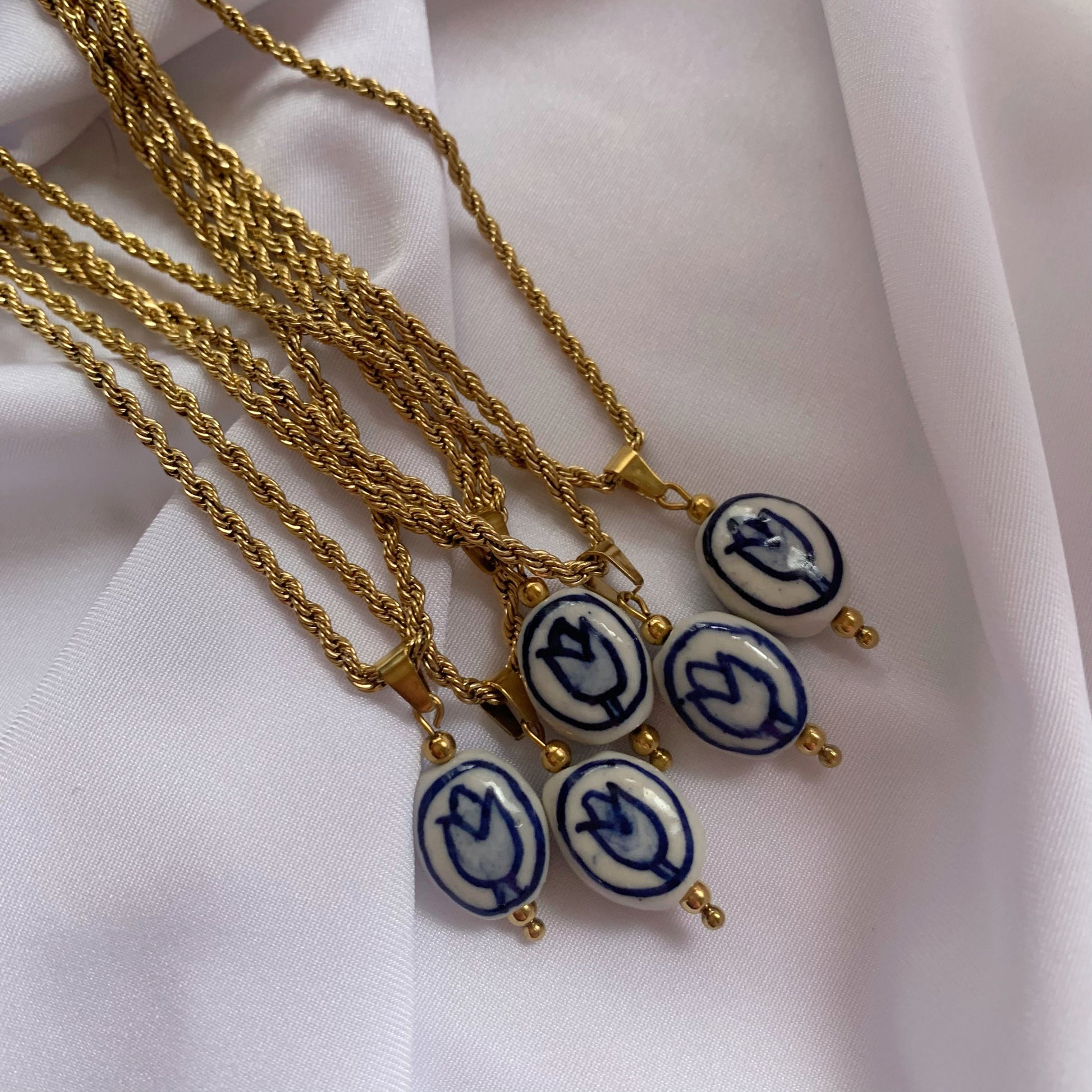 Collana torchon luminosa dallo spessore di circa 0,2 mm con ciondolo ovale in porcellana con motivo floreale blu. Nel pendente viene raffigurato un tulipano, fiore che spesso viene associato all'amore puro e sincero, è uno dei primi fiori a sbocciare in primavera per cui rappresenta rinascita, rinnovamento e nuovi inizi, la resilienza dopo un lungo periodo di difficoltà. Il disegno non è eccessivamente complesso, anzi con le sue linee elementari, si vuole sottolineare la bellezza della semplicità e dell'autenticità.