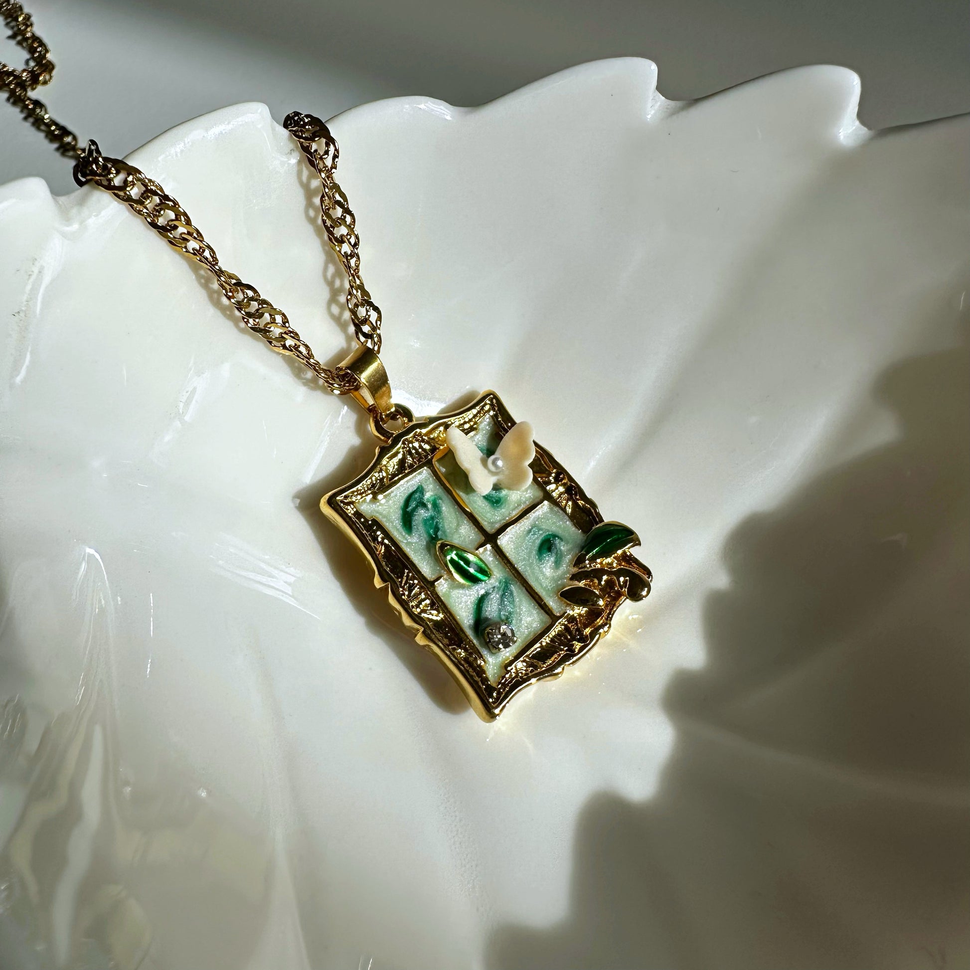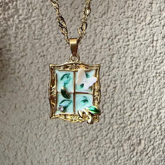 Al centro, un delicato ciondolo a forma di finestra che si apre su un piccolo mondo di dettagli: smalto sfumato verde chiaro, una farfalla leggera 3D e un piccolo zircone che cattura la luce in modo incantevole.
