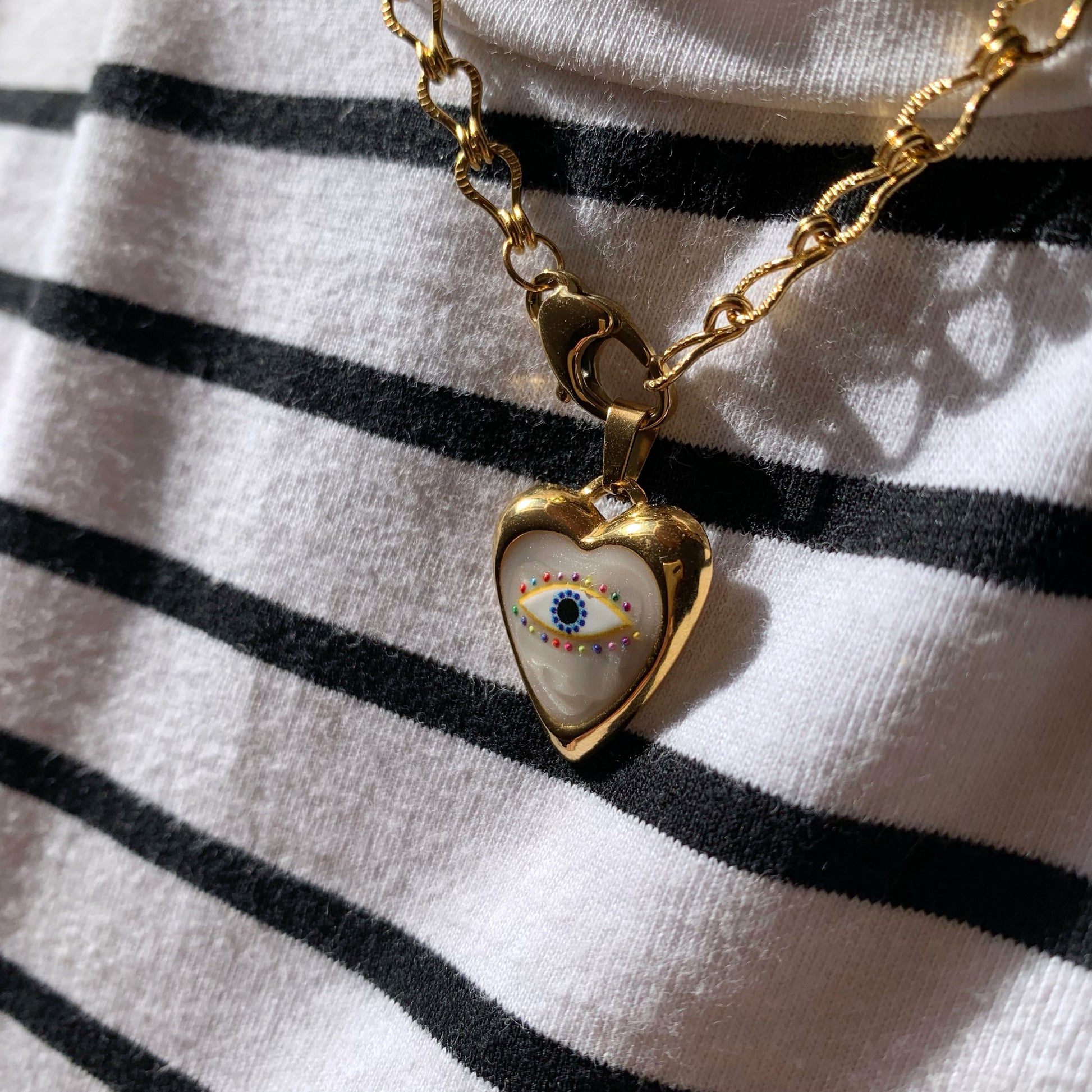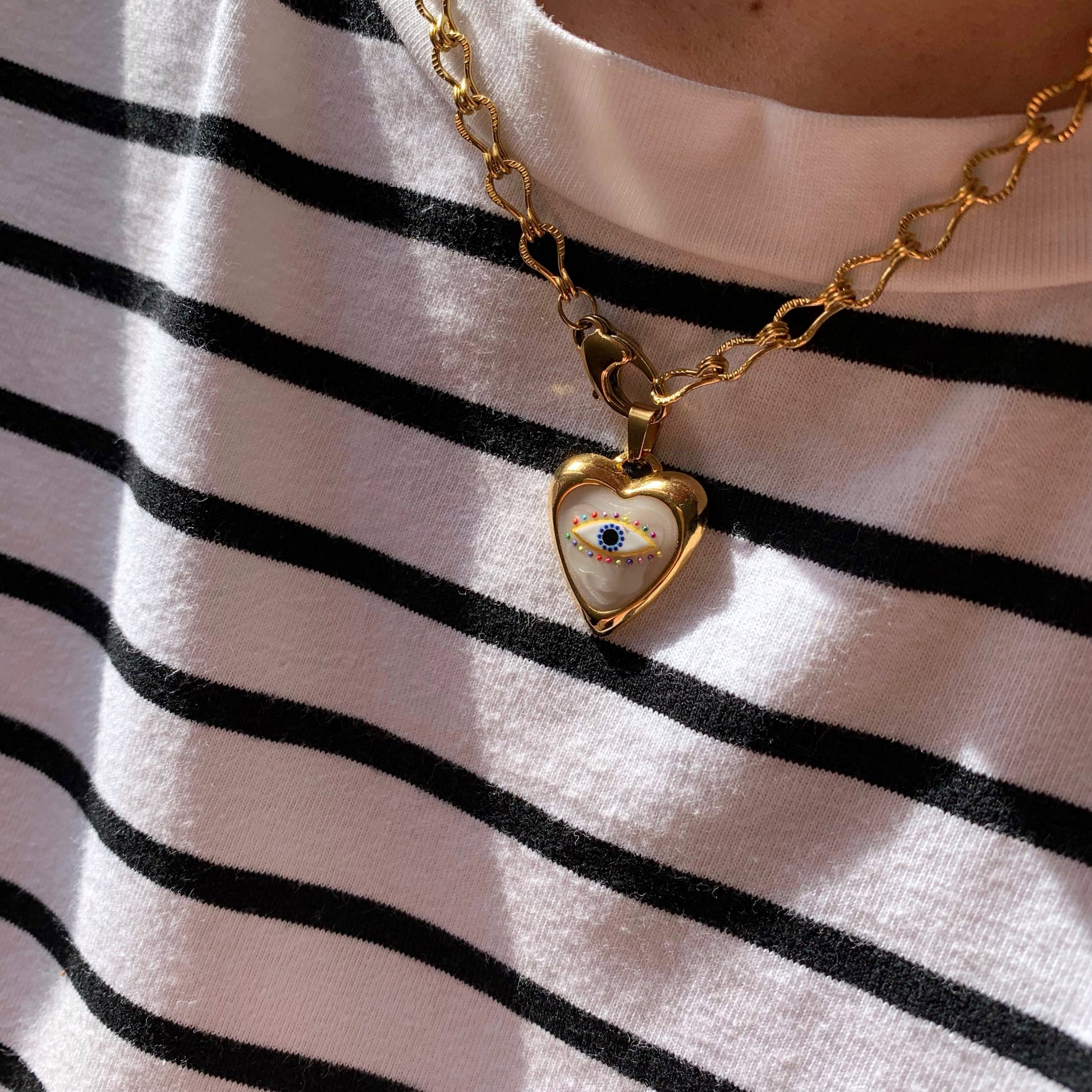 Collana dal design particolare, simbolico e raffinato. La catena è composta da maglie di forma ovale, termina con un gancio/chiusura ovale ma impercettibilmente irregolare a cui è agganciato un ciondolo carico di significato: un cuore leggermente bombato vuoto sul retro, al cui interno spicca un occhio stilizzato ispirato al tradizionale “occhio greco” portafortuna: un antico simbolo contro le energie negative. La base del ciondolo è smaltata di colore bianco latte sfumato su cui spiccano dettagli colorati e moderni.