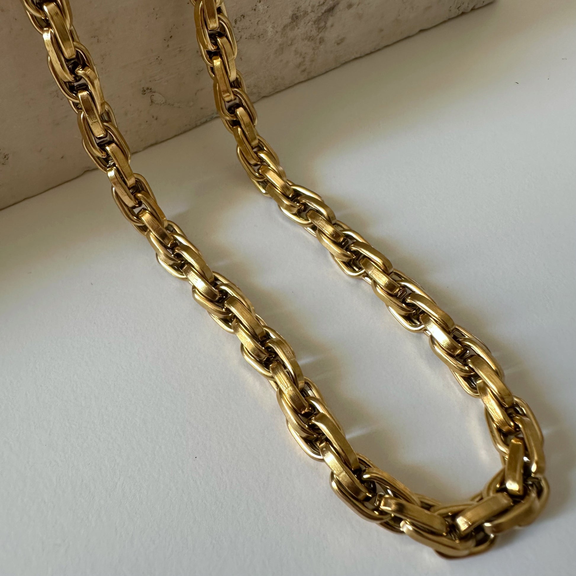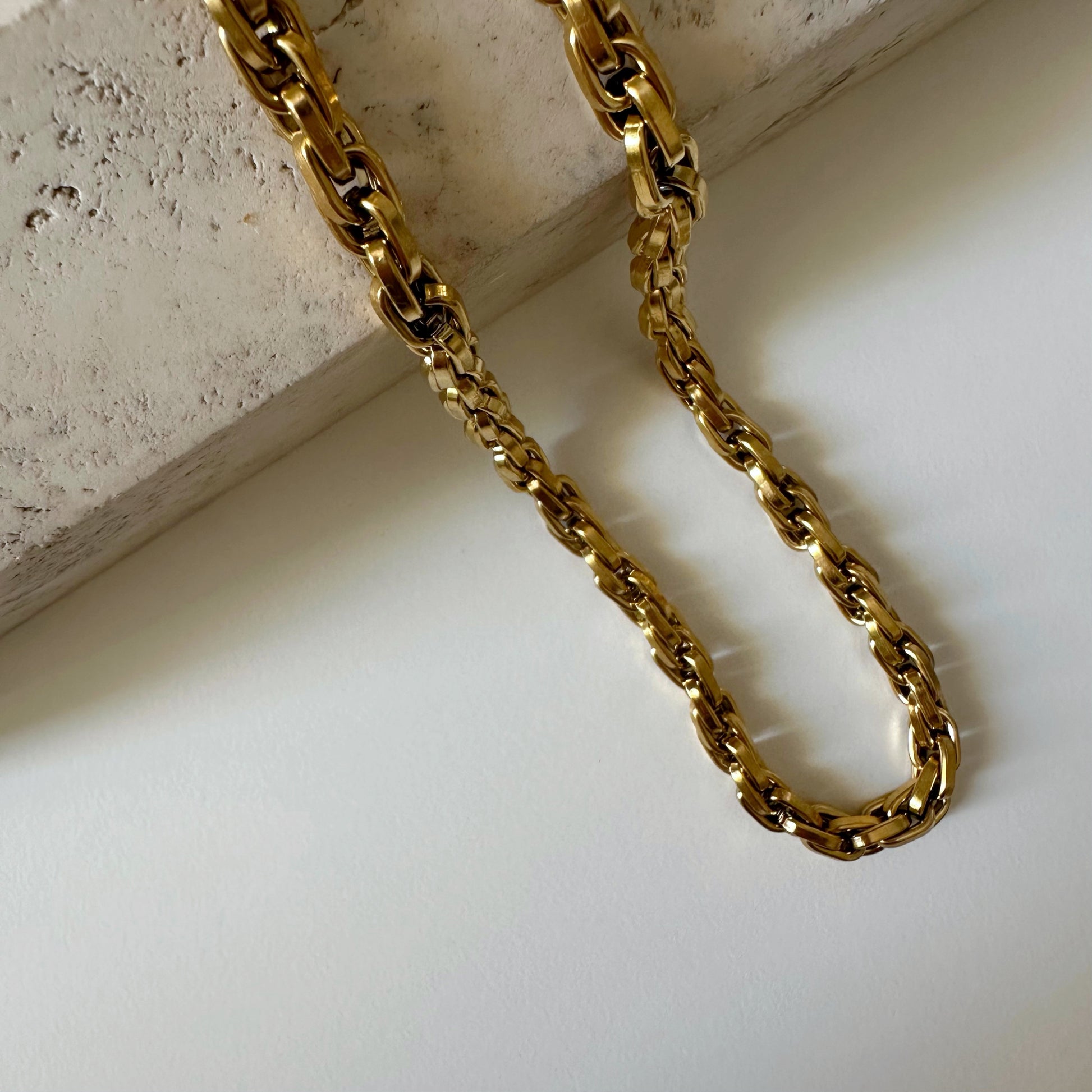 Catena importante lavorazione geometrica intrecciata, come vogliono le prossime tendenze. Indossala da sola per uno stile più basic o abbinata ad altre collane per creare un gioco di stili e forme sempre nuovo.