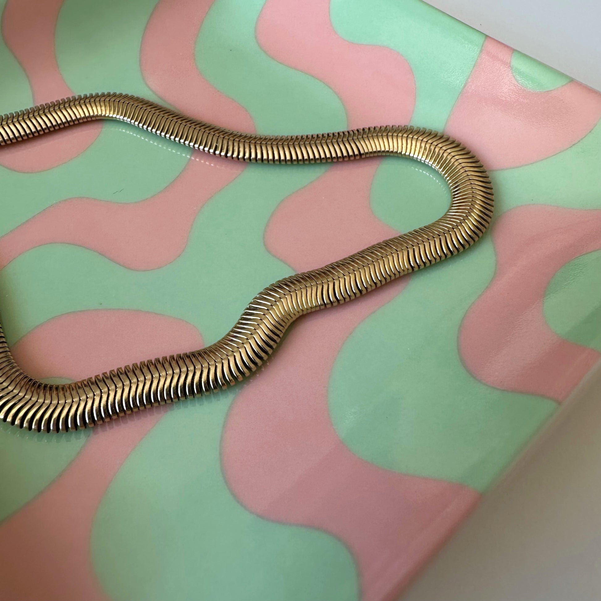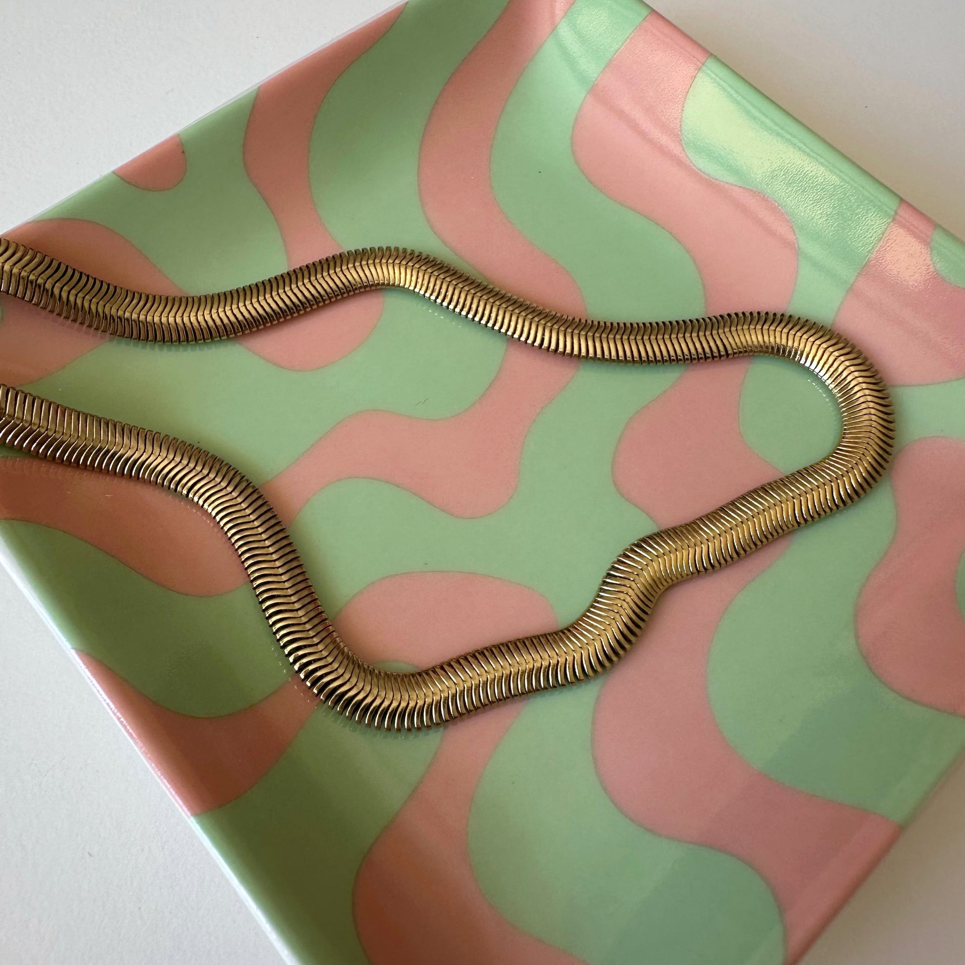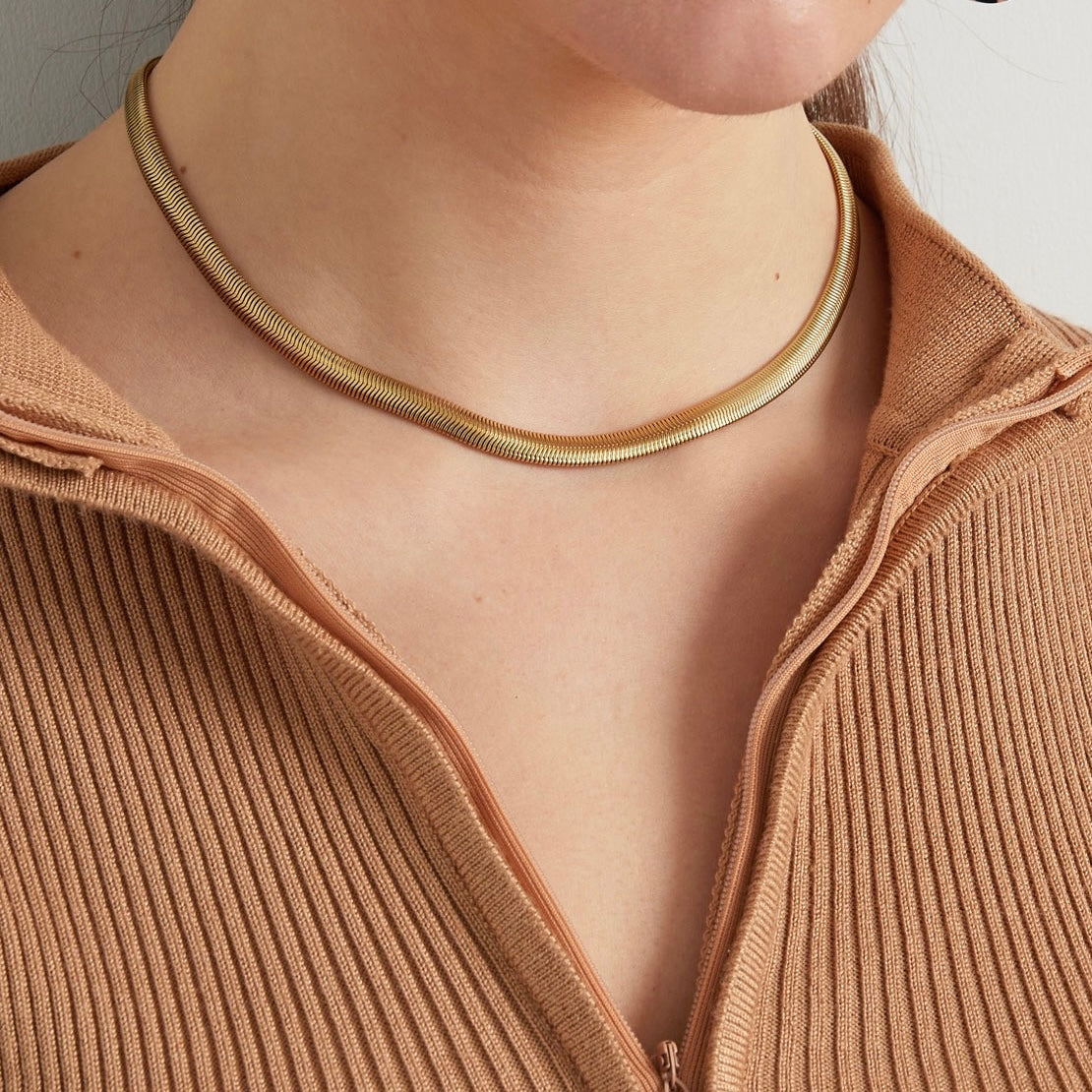 La Flat Necklace è una collana dal design contemporaneo, realizzata con una maglia piatta e flessibile che riflette la luce con discrezione e carattere. La sua struttura decisa la rende perfetta da indossare da sola per un effetto pulito e moderno, oppure abbinata ad altre collane per un layering di tendenza.