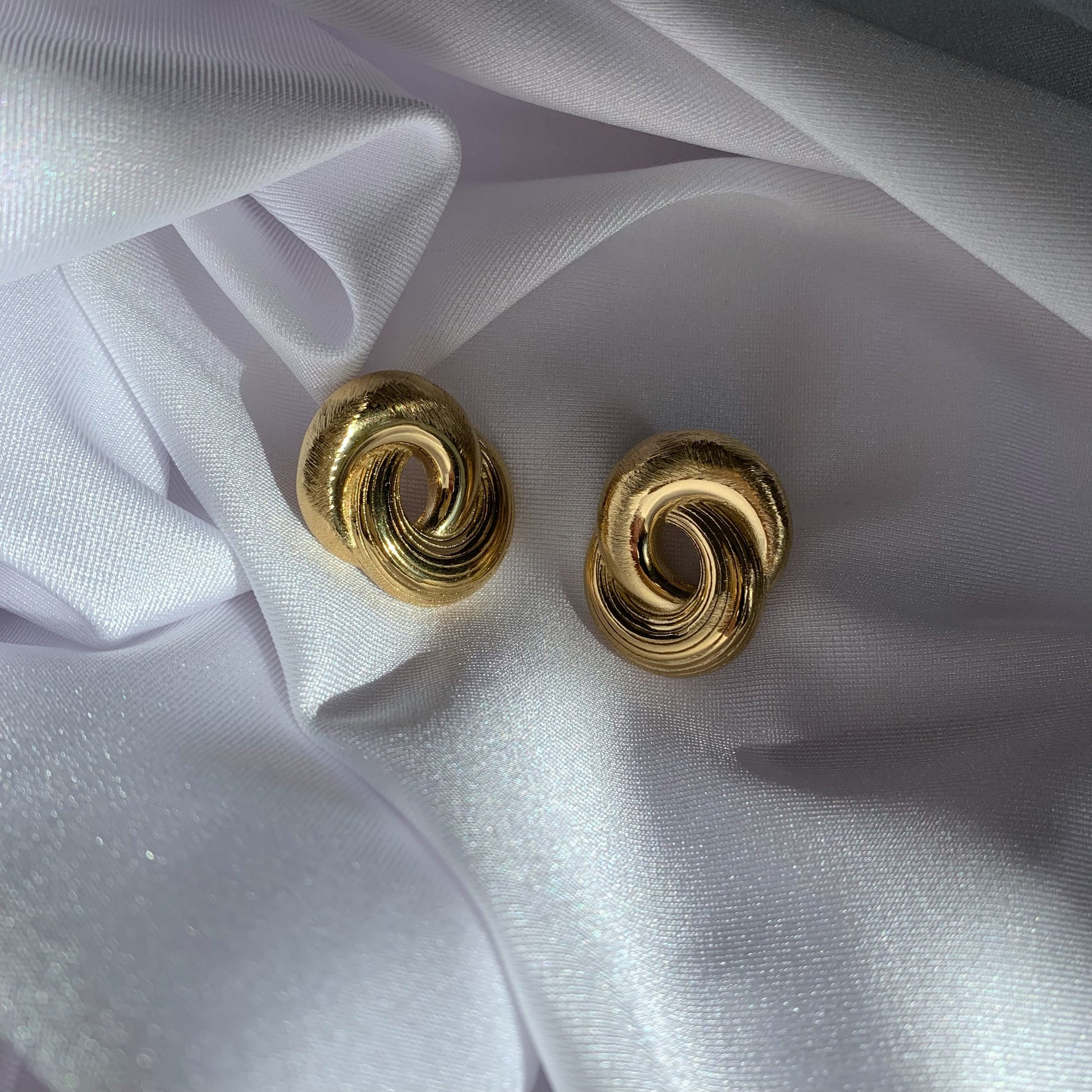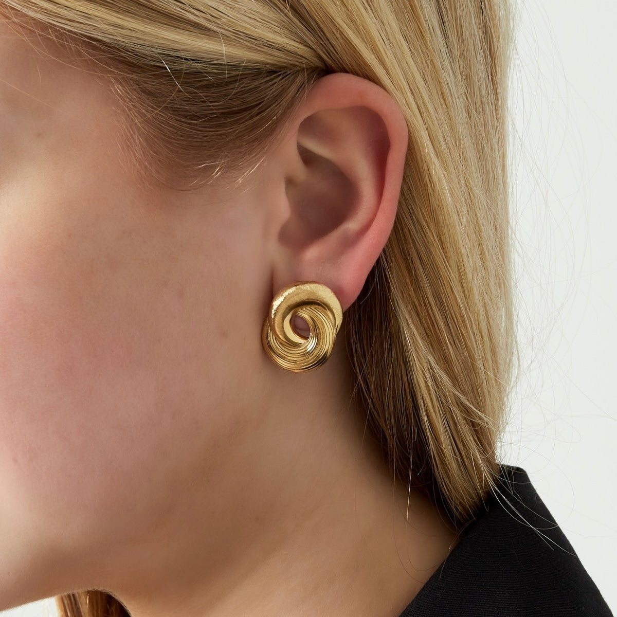 Coppia di orecchini intrecciati, caratterizzati da un elegante contrasto tra finitura satinata e rigata.
