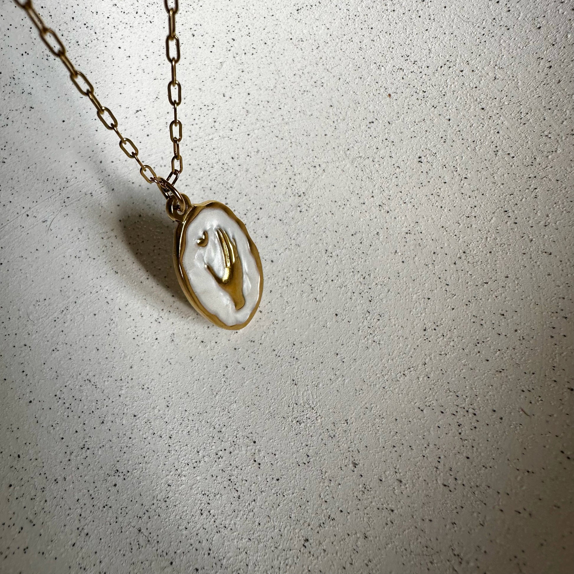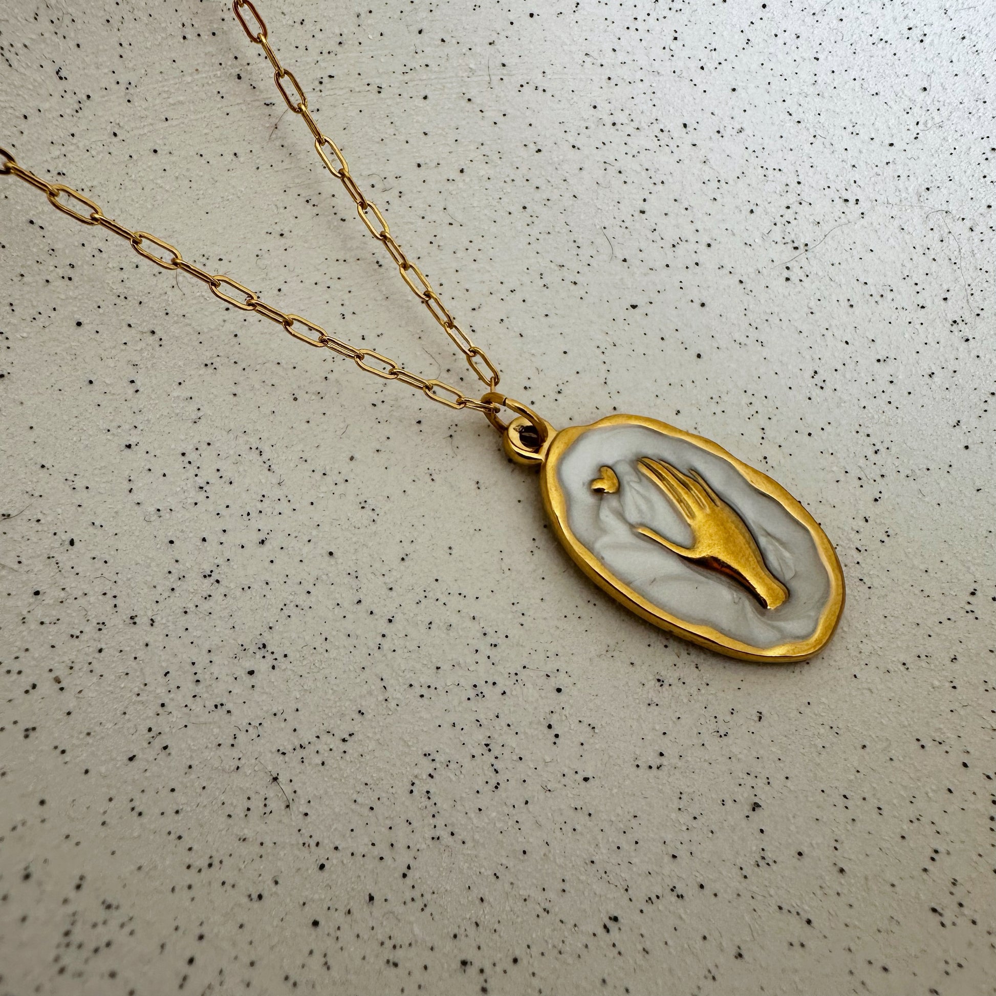 Nel suo ovale di smalto bianco latte, la mano sospesa racchiude l’istante fragile tra il trattenere e il lasciare andare. Il cuore che scivola via non è perdita, ma trasformazione: è il coraggio di aprire la mano e permettere all’amore, al dolore, ai ricordi, di trovare la propria strada.