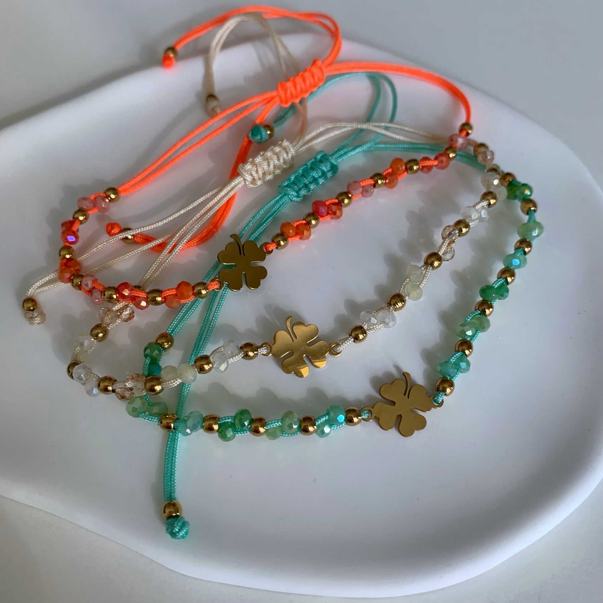 Bracciale realizzato con filo di poliestere, perline sfaccettate e componenti in acciaio inossidabile. Il bracciale si può adattare alle misure di ogni polso tirando delicatamente il cordino.
