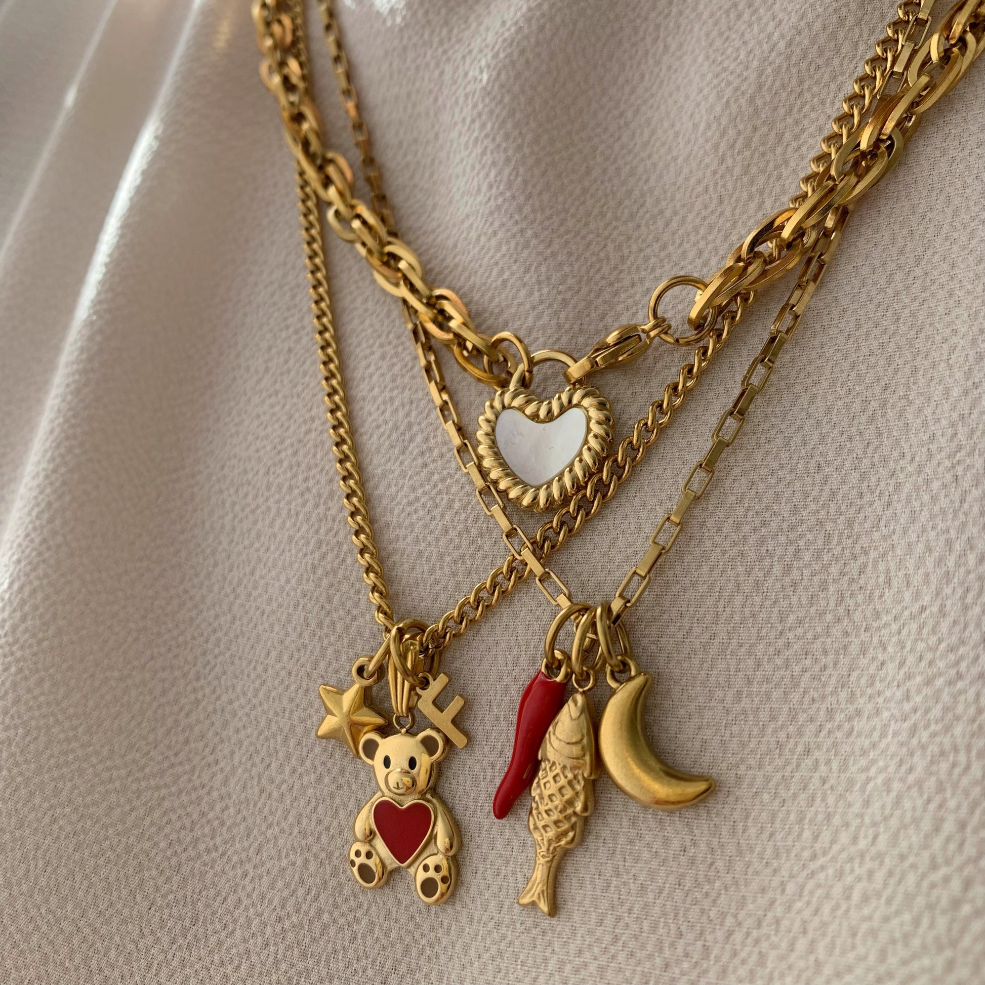 Collana a maglie rettangolari con 3 ciondoli estraibili: mezza luna, cornino smaltato rosso e pesce porta fortuna.
