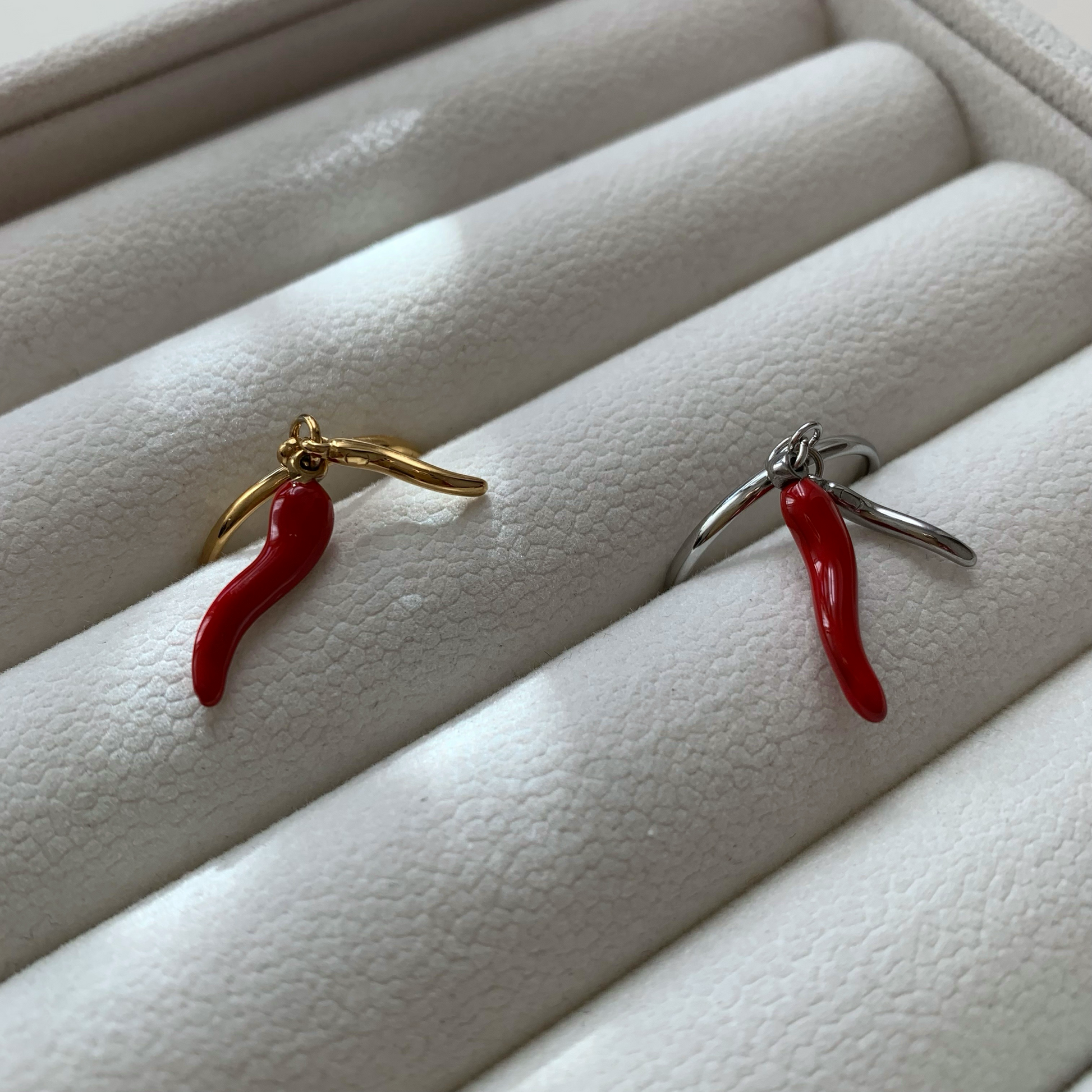 Anello regolabile con mini cornino dorato e cornino rosso, disponibile nella versione dorata o argentata.