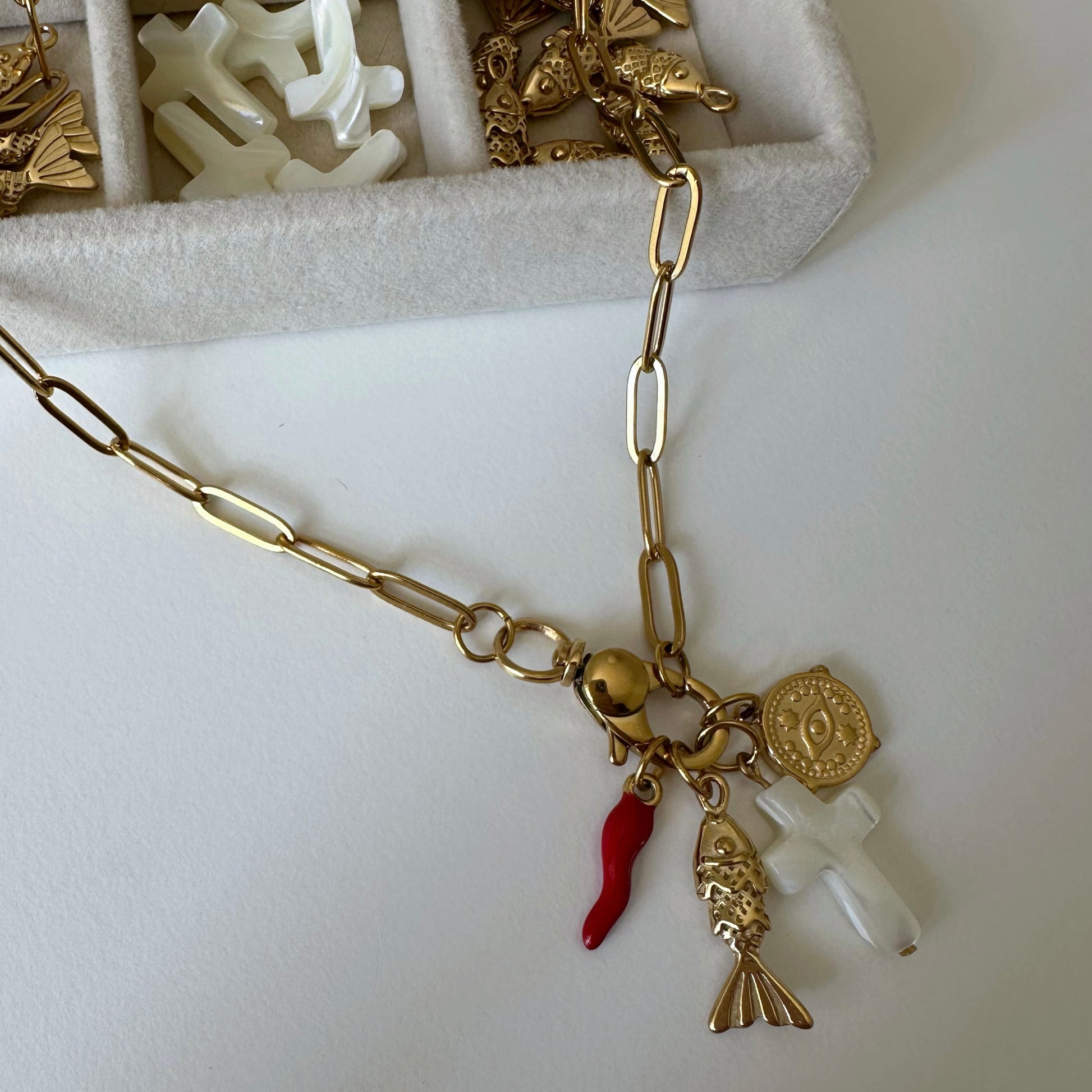 All'interno del moschettone sono agganciati quattro ciondoli portafortuna: il classico cornino rosso; una croce in madreperla, delicata e luminosa, simbolo di fede e protezione; una medaglietta con occhio greco, amuleto contro le energie negative; un pesce stilizzato, simbolo di abbondanza, libertà e buona fortuna.
