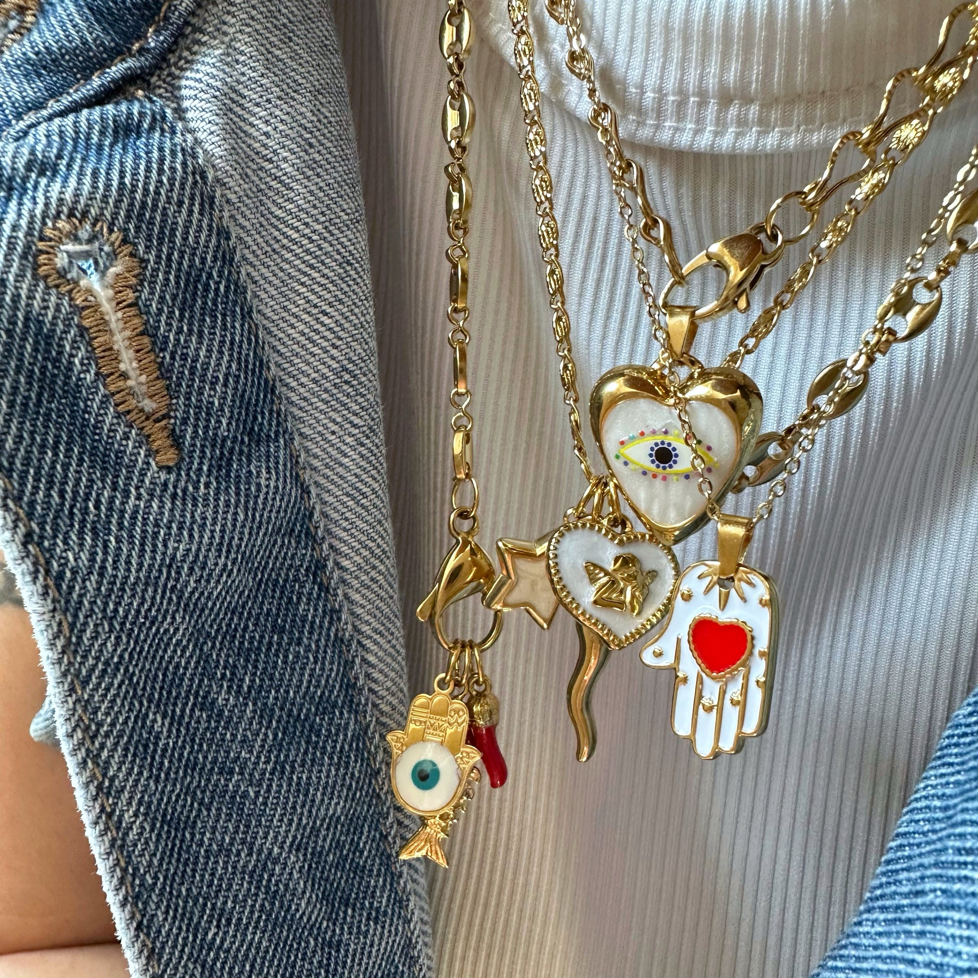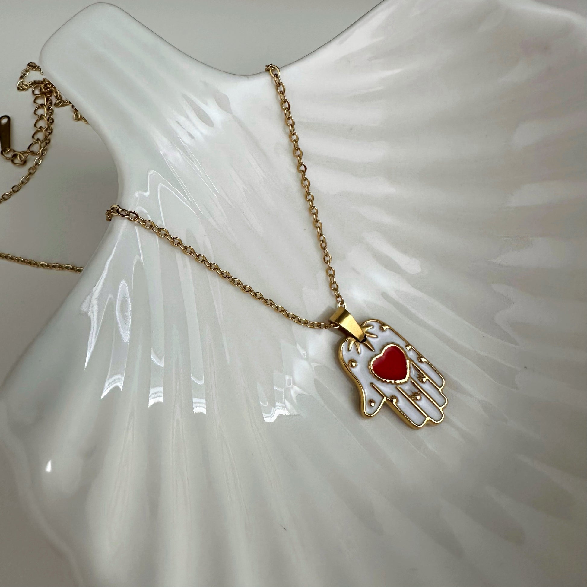 Manita Chain unisce stile e significato: mano smaltata bianca con un cuore rosso al centro, simbolo di amore, protezione e positività. Perfetta da indossare da sola o come base per un layering a tema fortuna e protezione!