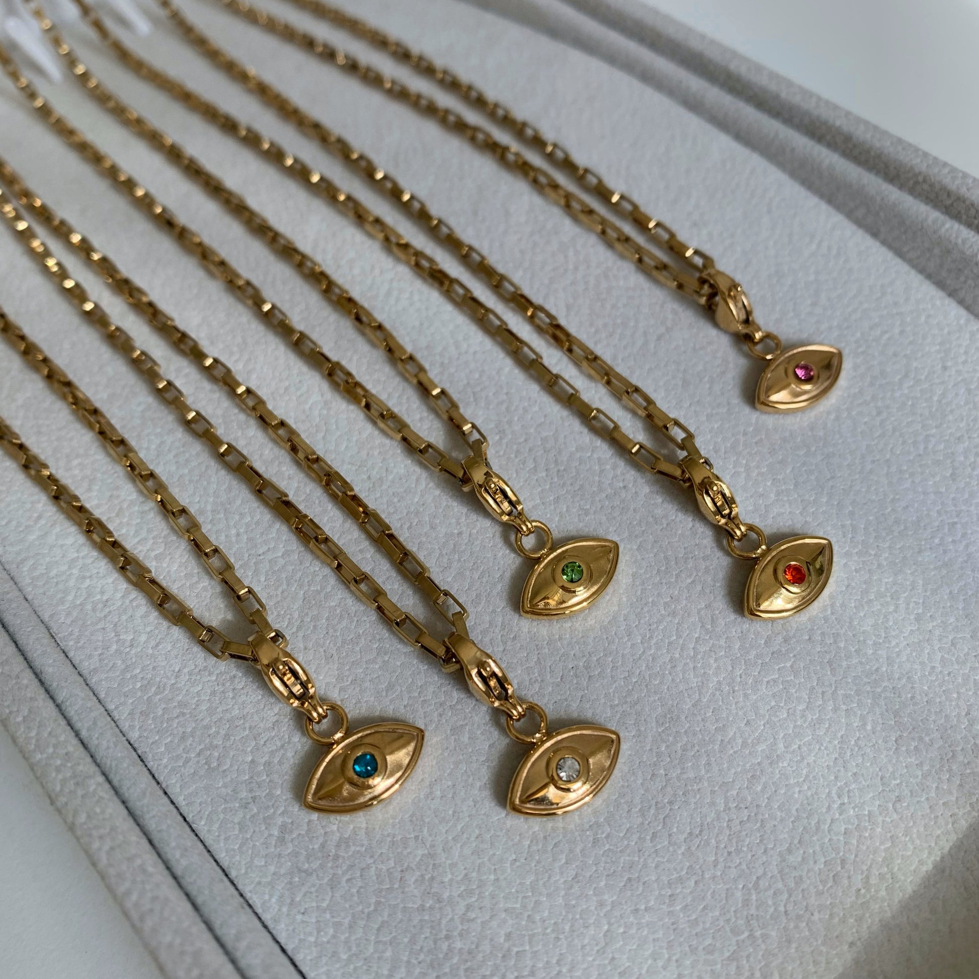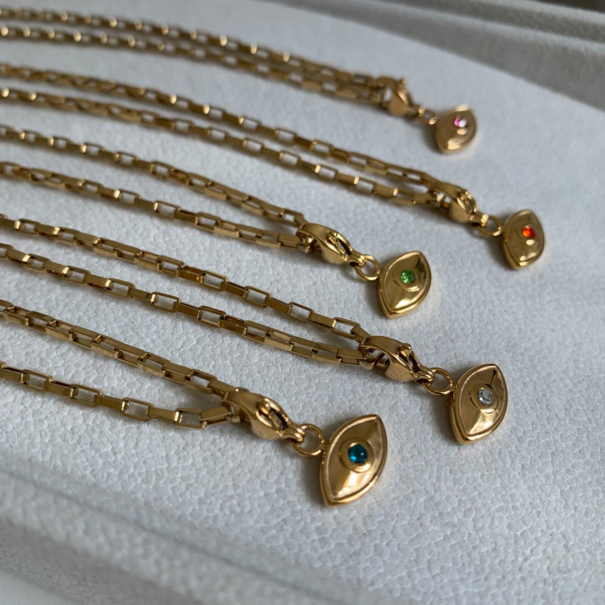 La catenina, sottile e delicata, con maglie piccole rettangolari. Il simbolo dell'occhio, oltre a essere un dettaglio estetico affascinante, è noto per la sua funzione protettiva, capace di allontanare le energie negative e portare fortuna a chi lo indossa.