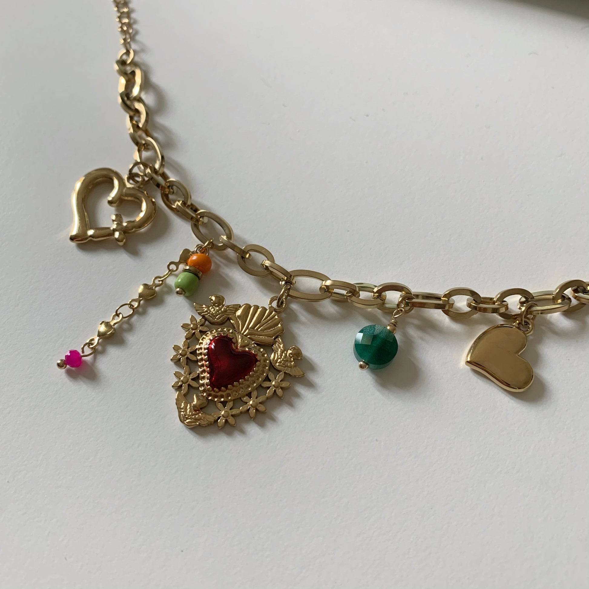 Un mix di forme e materiali tra cui perline di vetro ed ematite si uniscono per dare vita al bracciale multicharms "Milagros Heart", nel quale spicca il Cuore di Milagros smaltato rosso scuro. Ciondolo pieno di significato che rappresenta amore, passione, protezione e devozione.