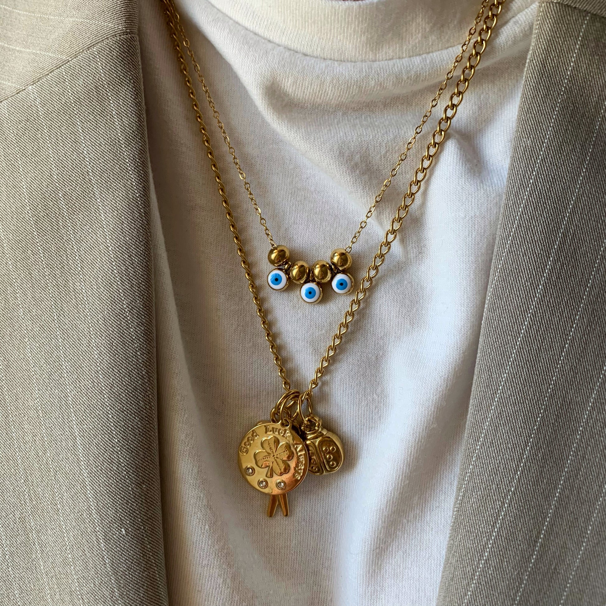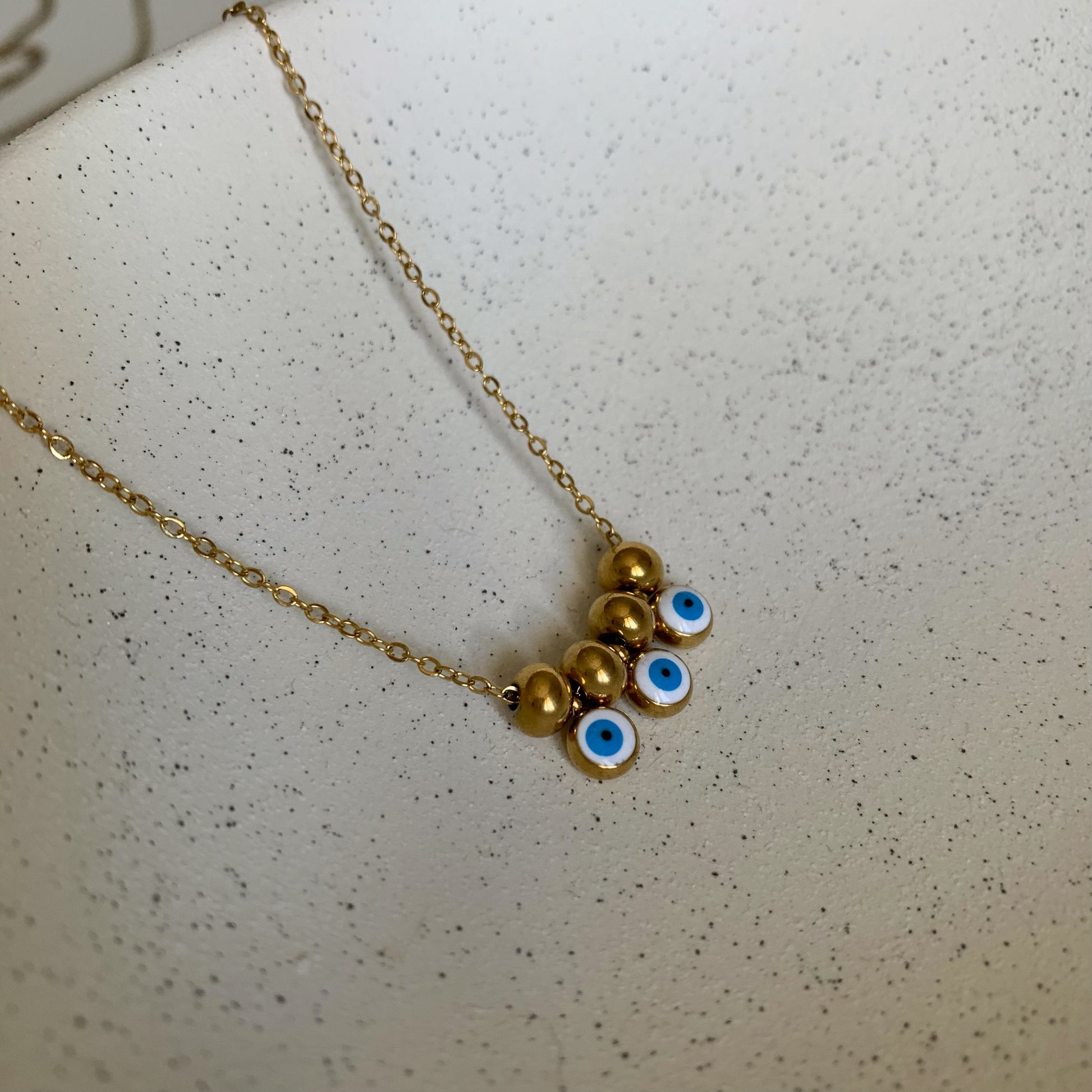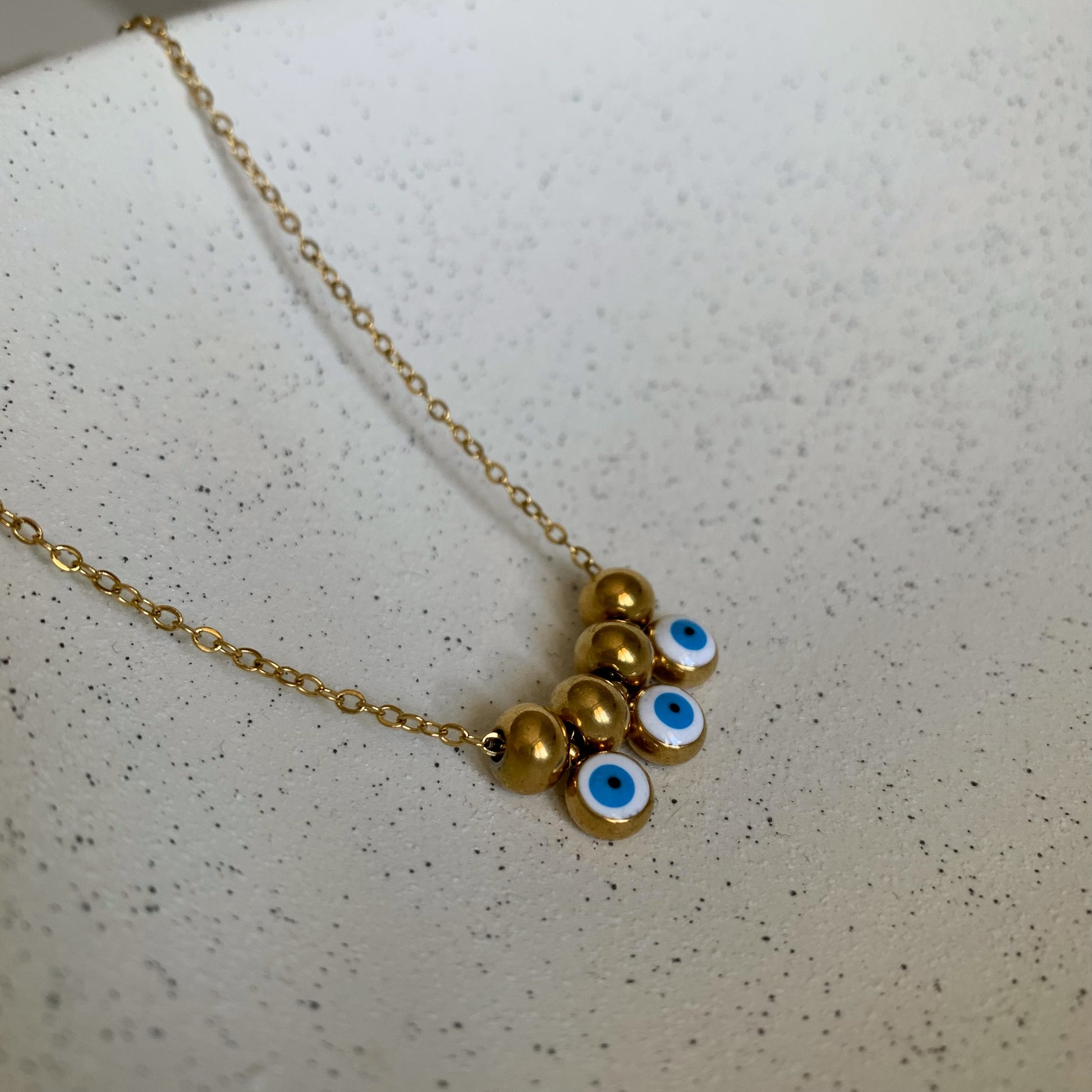 Realizzata con una catena forzatina sottile, la collana è impreziosita da tre ciondoli passanti a forma di occhio greco, portafortuna tradizionale simbolo di protezione, intervallati da piccole sfere lisce che aggiungono equilibrio e lucentezza al design.