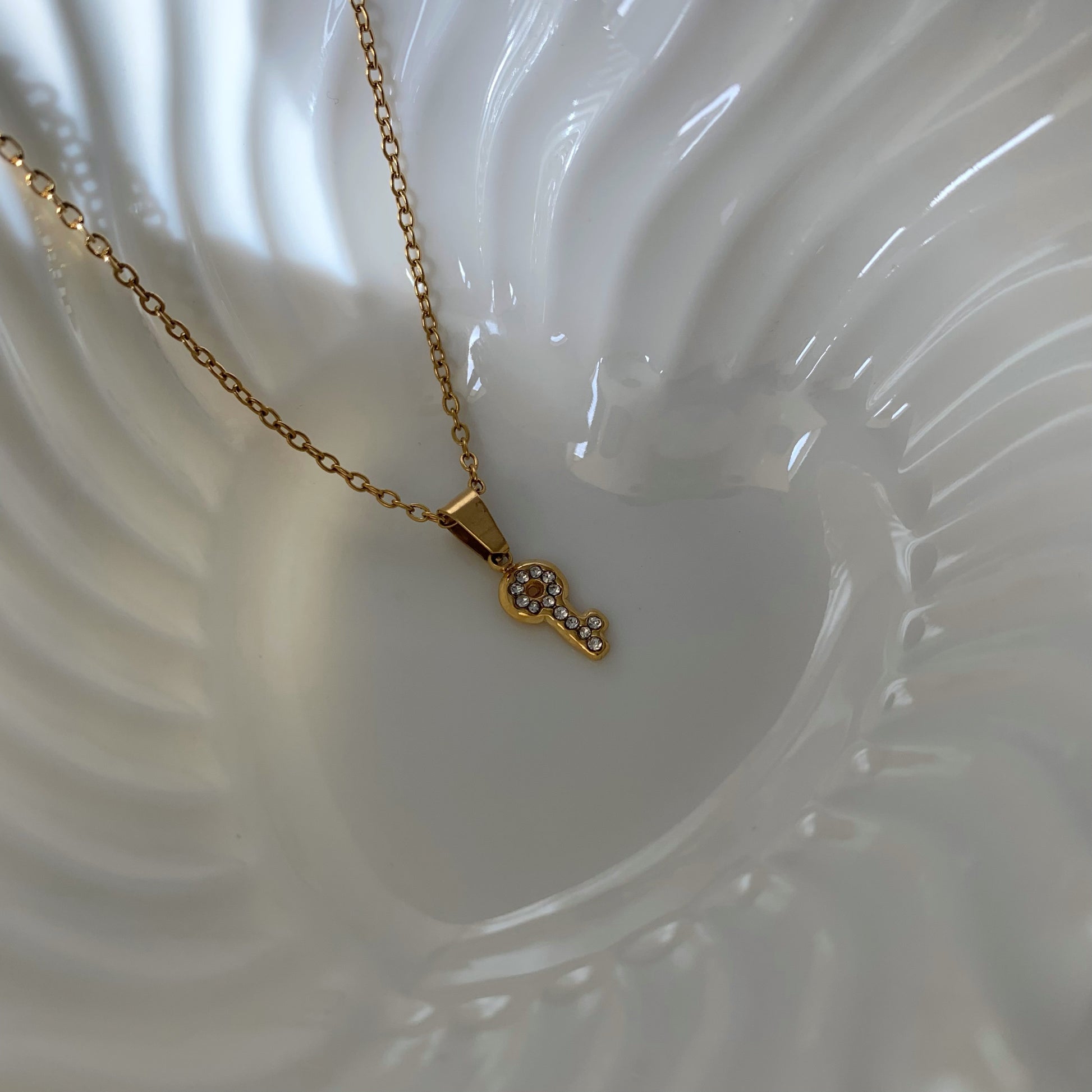 Collana realizzata con semplice maglia forzatina e piccolo ciondolo a forma di chiave con zirconi bianchi incastonati.