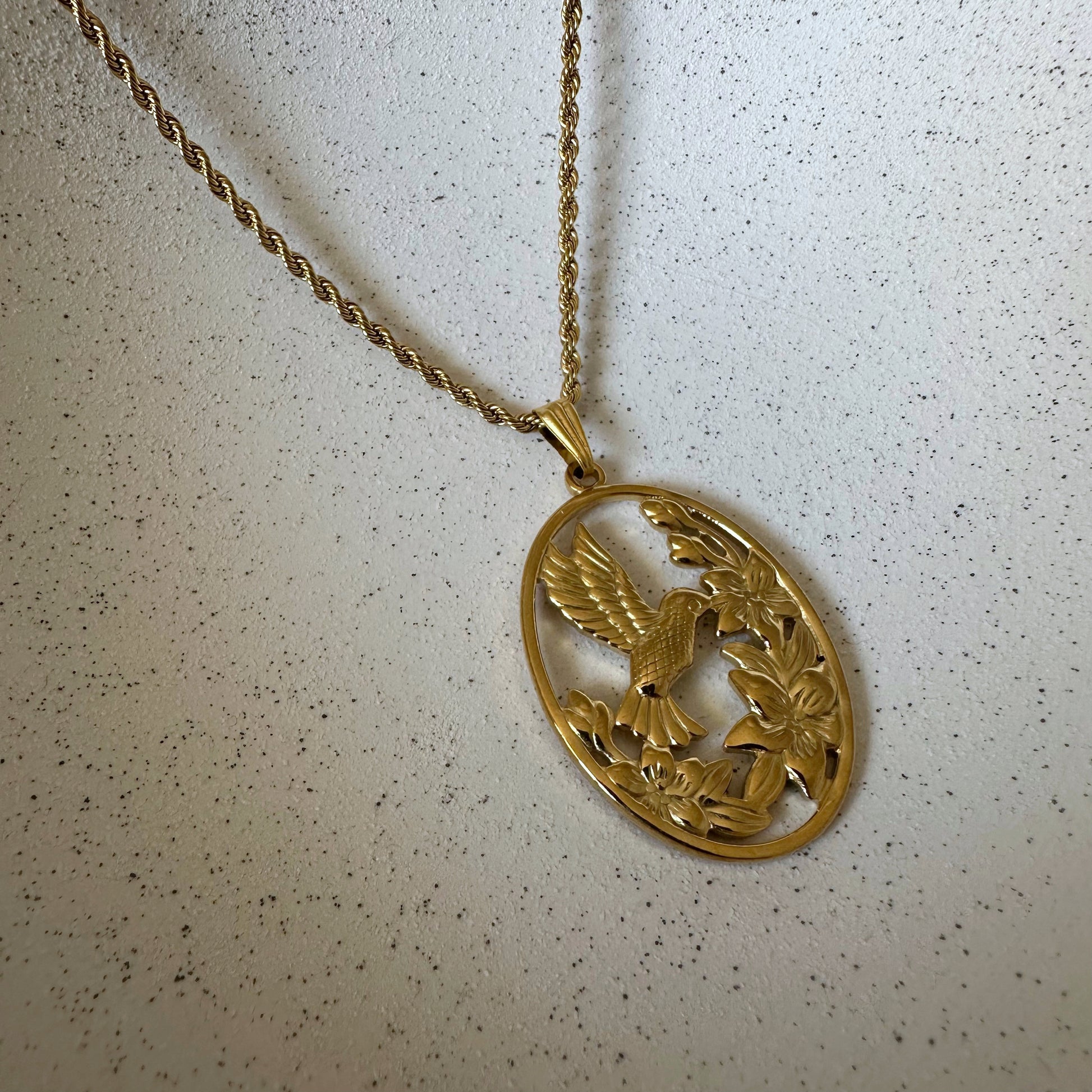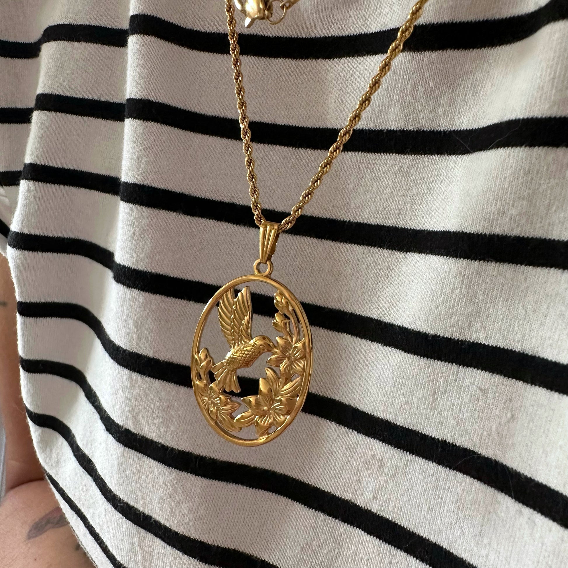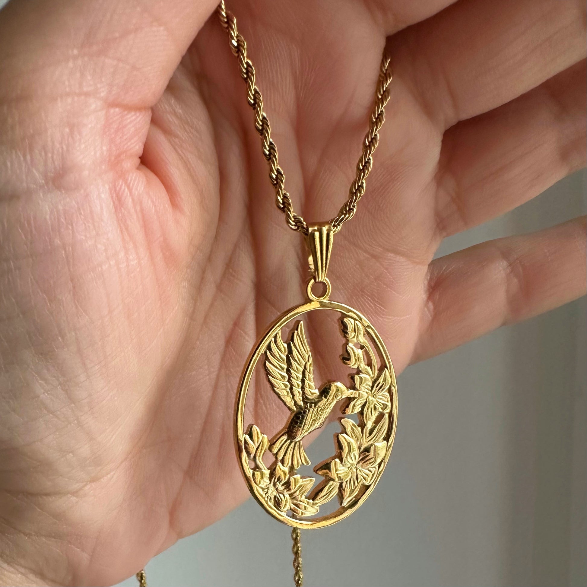 Il medaglione, finemente lavorato, racchiude al centro un piccolo uccellino in volo, scolpito con incredibile delicatezza, sospeso nell’attimo prima di posarsi su una decorazione floreale in rilievo. I dettagli minuti – le piume, i petali incisi, le venature dei fiori – sembrano raccontare la maestria artigianale di un’epoca passata.