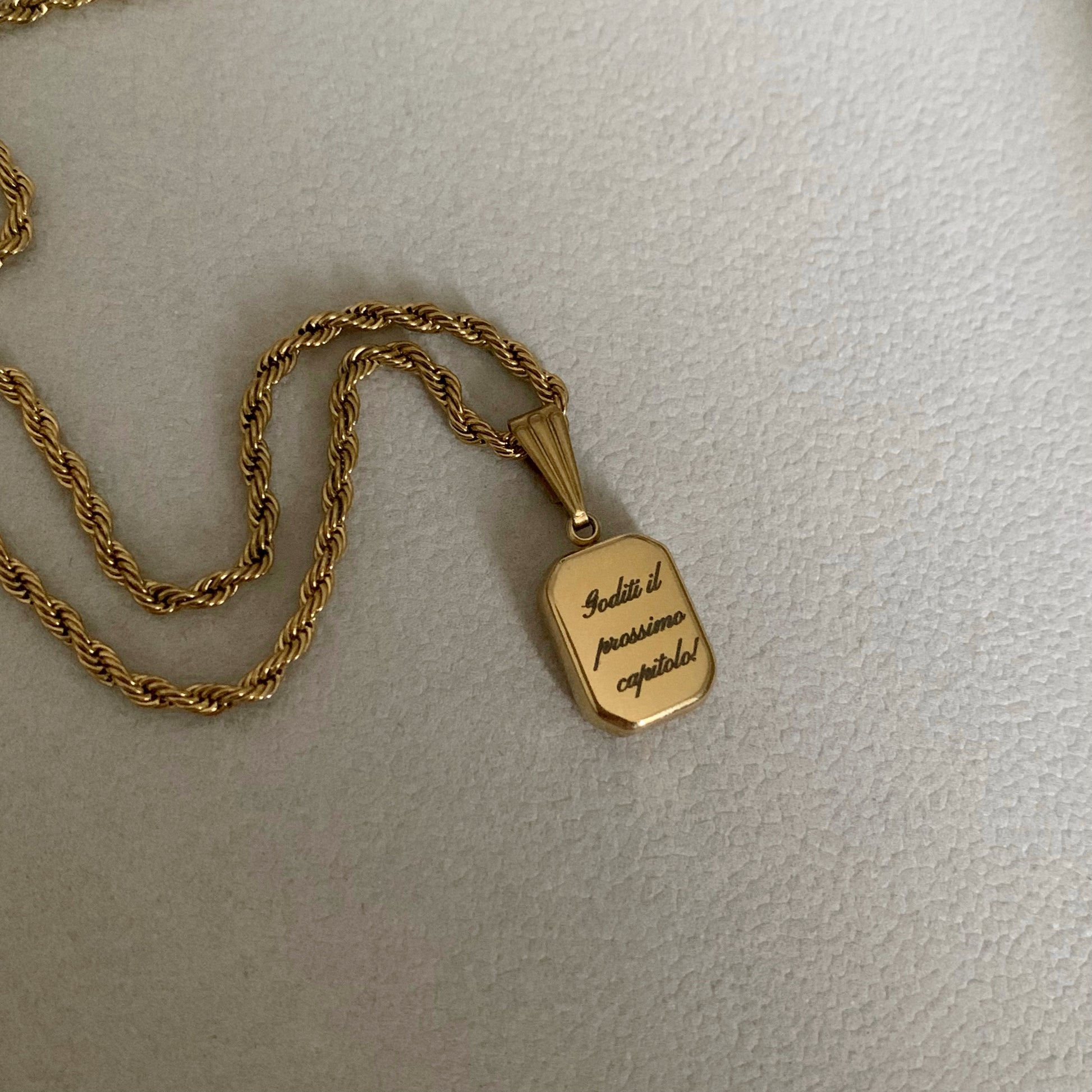 Lascia che ogni nuovo inizio sia accompagnato da un simbolo di forza e speranza. Questa collana custodisce un ciondolo inciso con le parole "Goditi il prossimo capitolo", un promemoria che invita ad abbracciare il futuro con fiducia.