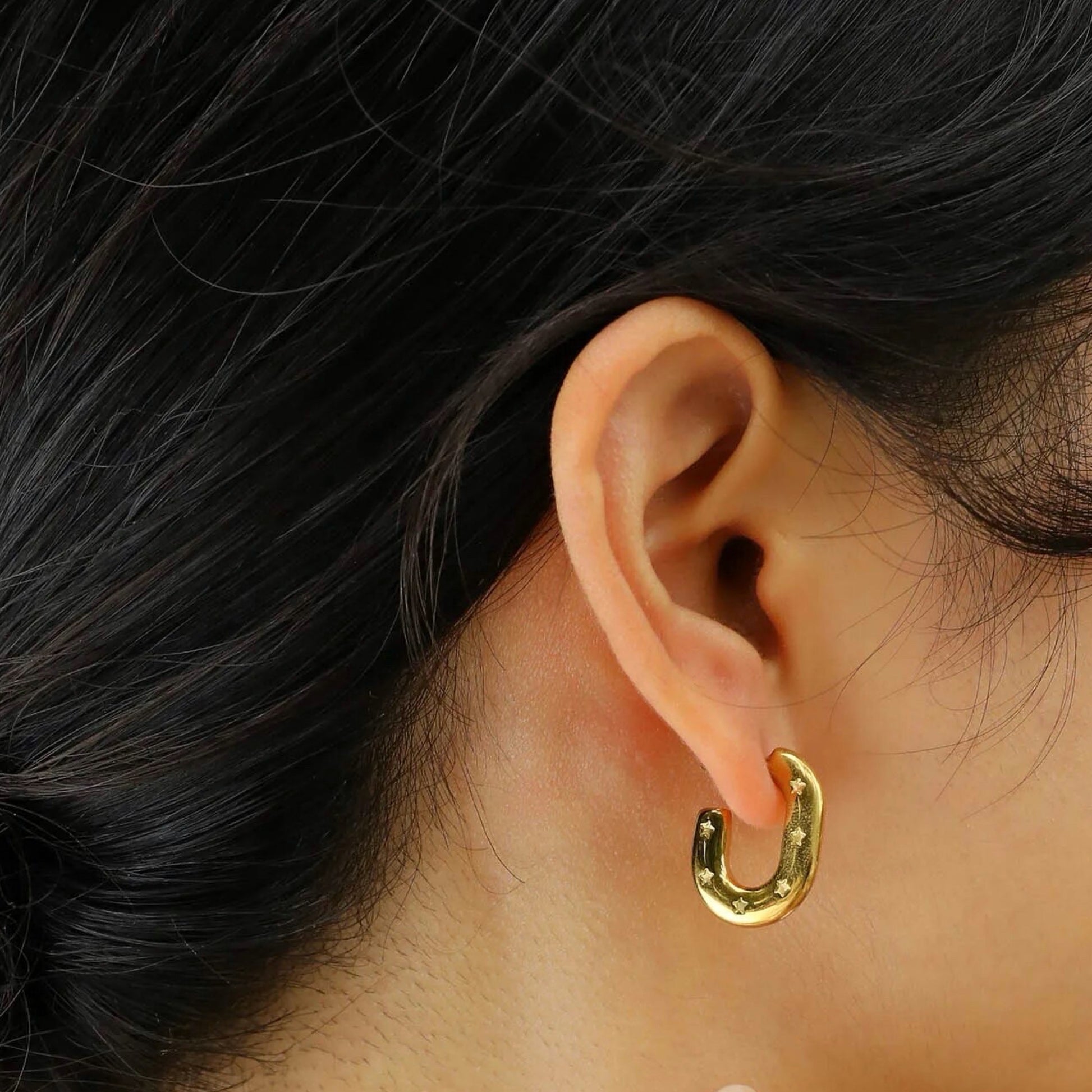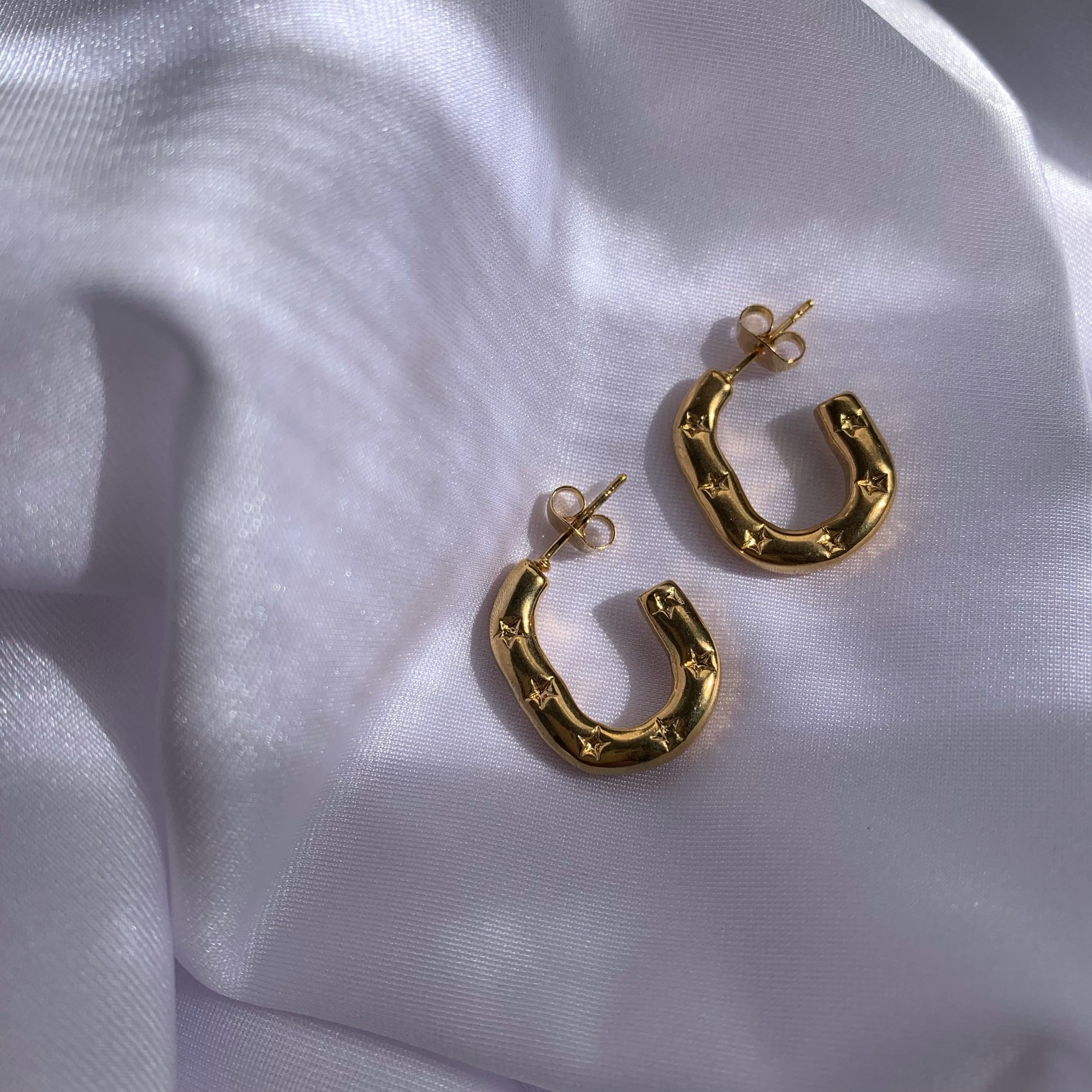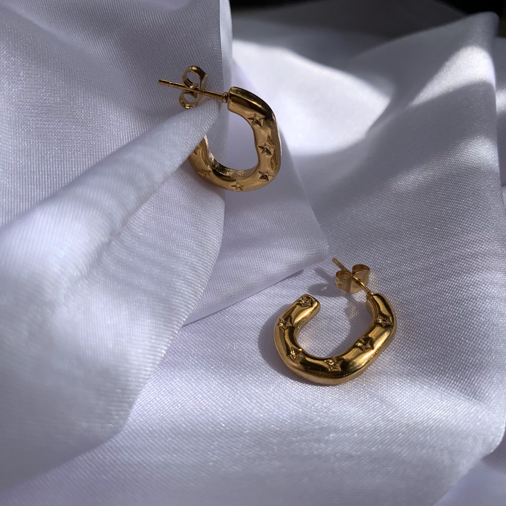 Coppia di orecchini leggeri con stelline incise sulla superficie, chiusura con farfallina.