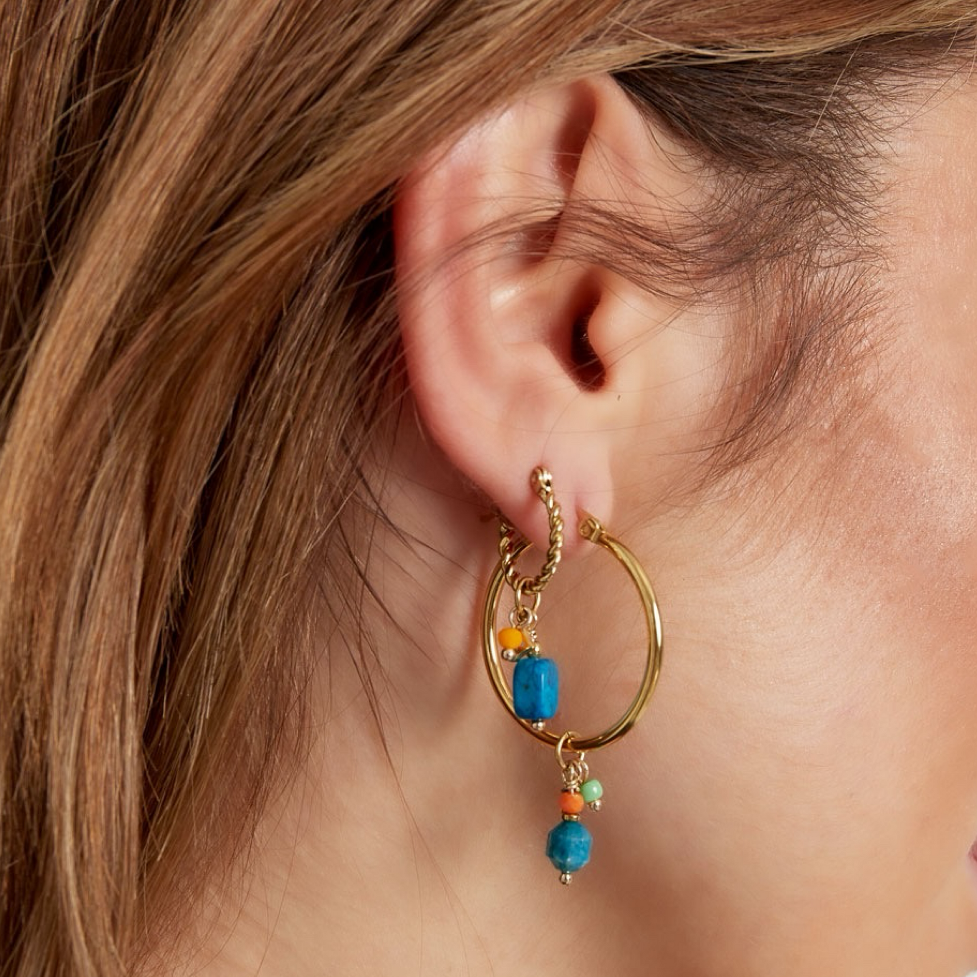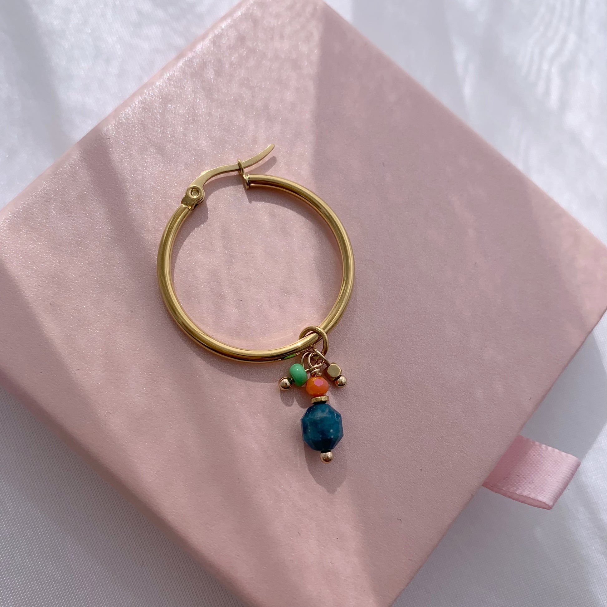 Mono orecchino a cerchio liscio con ciondolo blu e dettagli di perline colorate. Il ciondolo è estraibile.