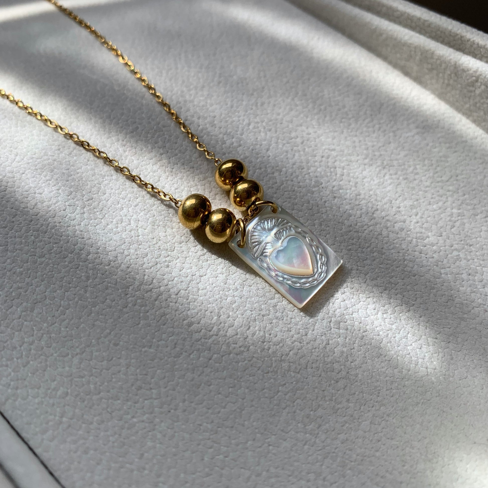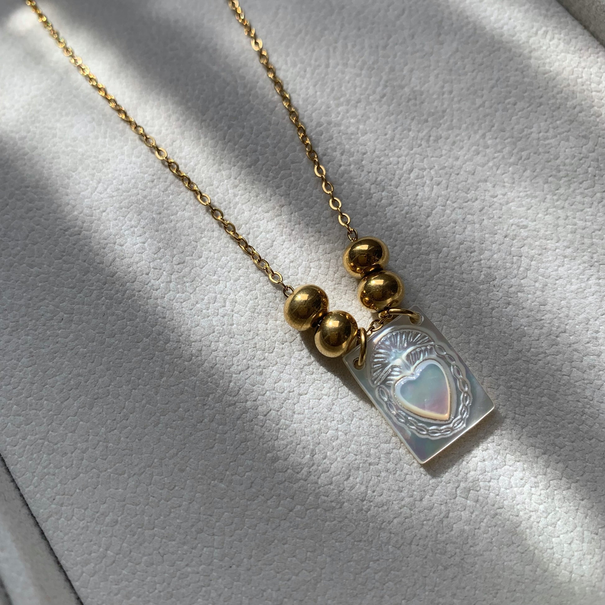 Collana maglia forzatina luminosa con palline e targhetta in madreperla raffigurante il cuore sacro.