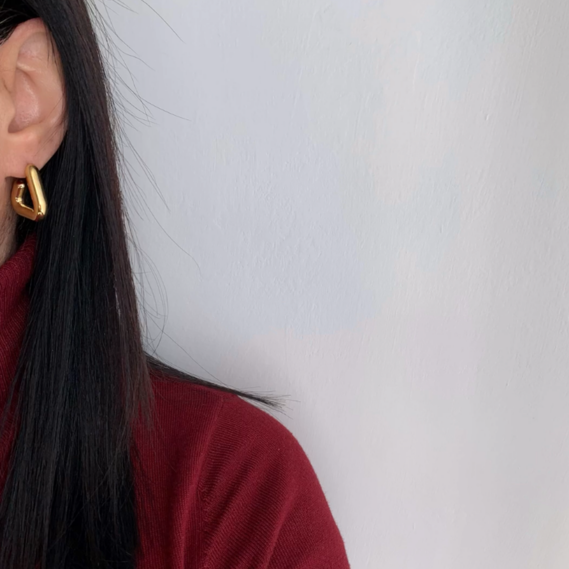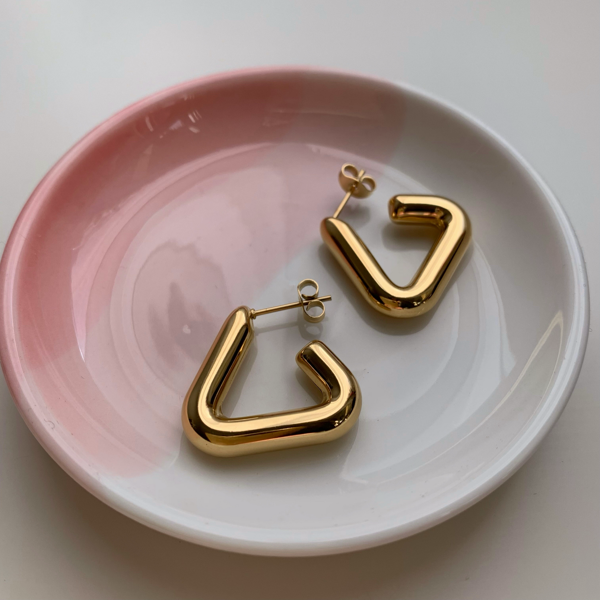 Orecchini a forma di triangolo aperto, bombati ma leggeri, chiusura con farfallina.