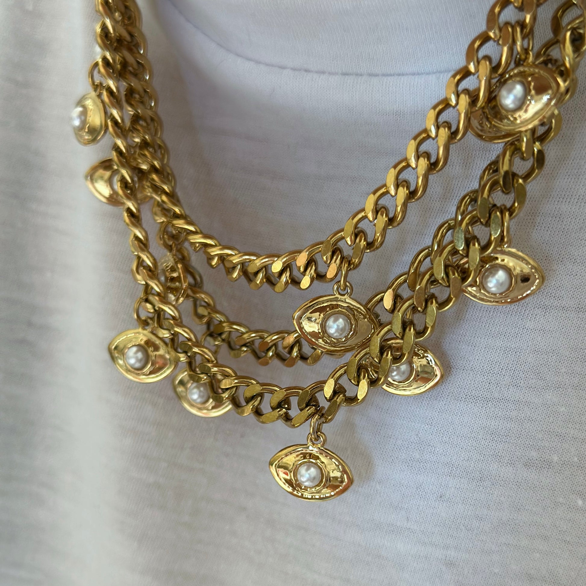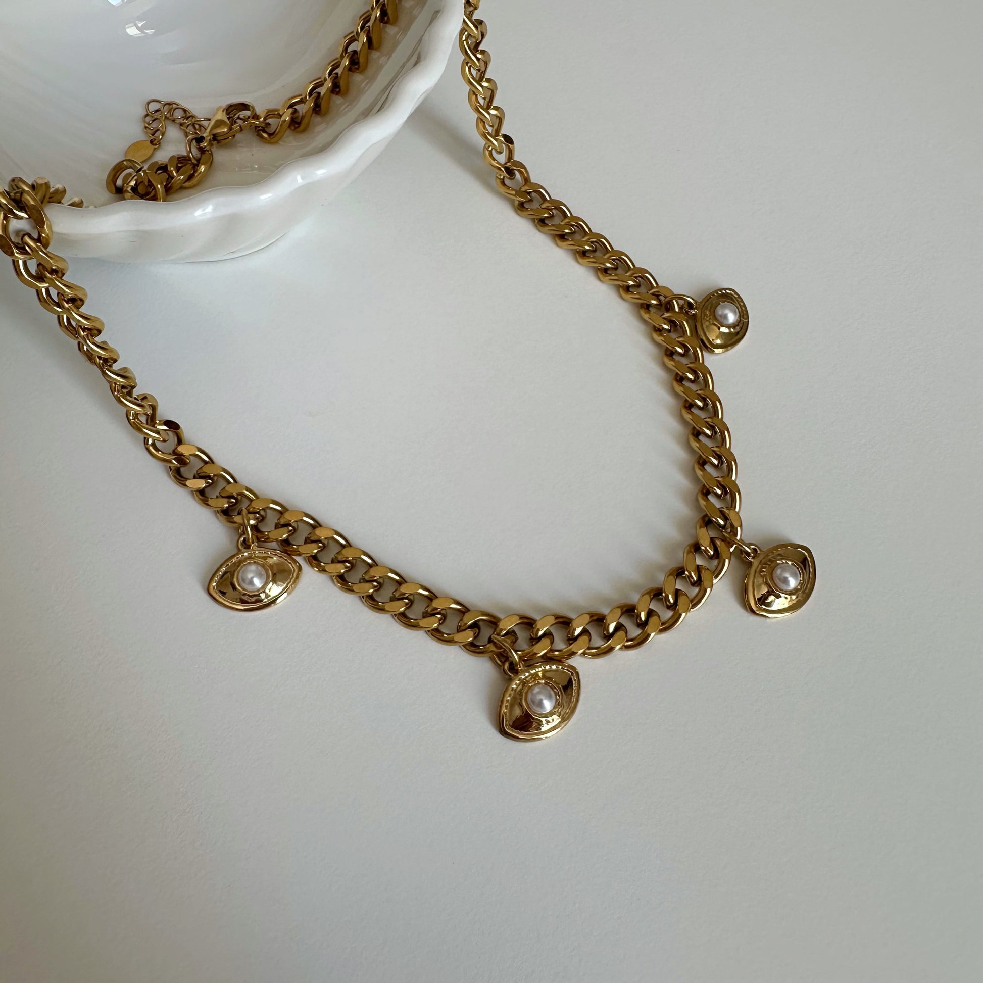 Collana in maglia groumette dal design deciso ma elegante, con uno spessore di 0,5 cm che dona solidità e carattere. A impreziosire la catena, quattro ciondoli a forma di occhio – simbolo antico di protezione contro il malocchio – distribuiti armoniosamente lungo la lunghezza.