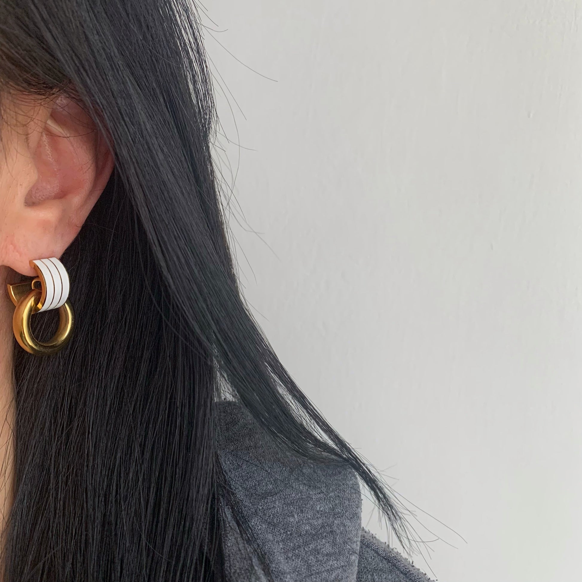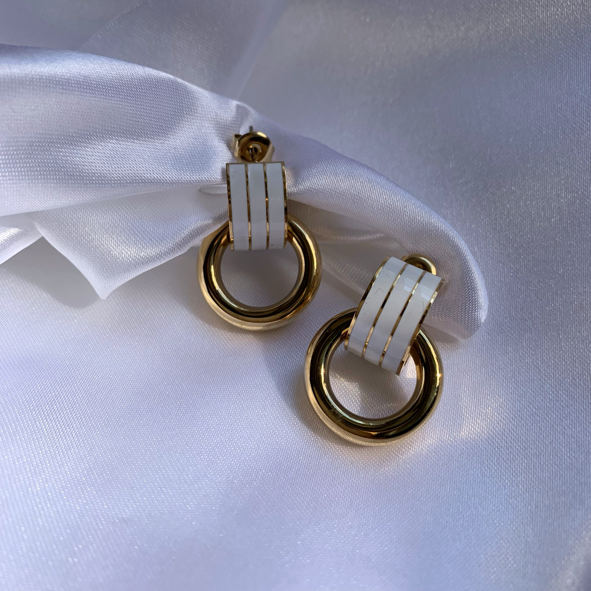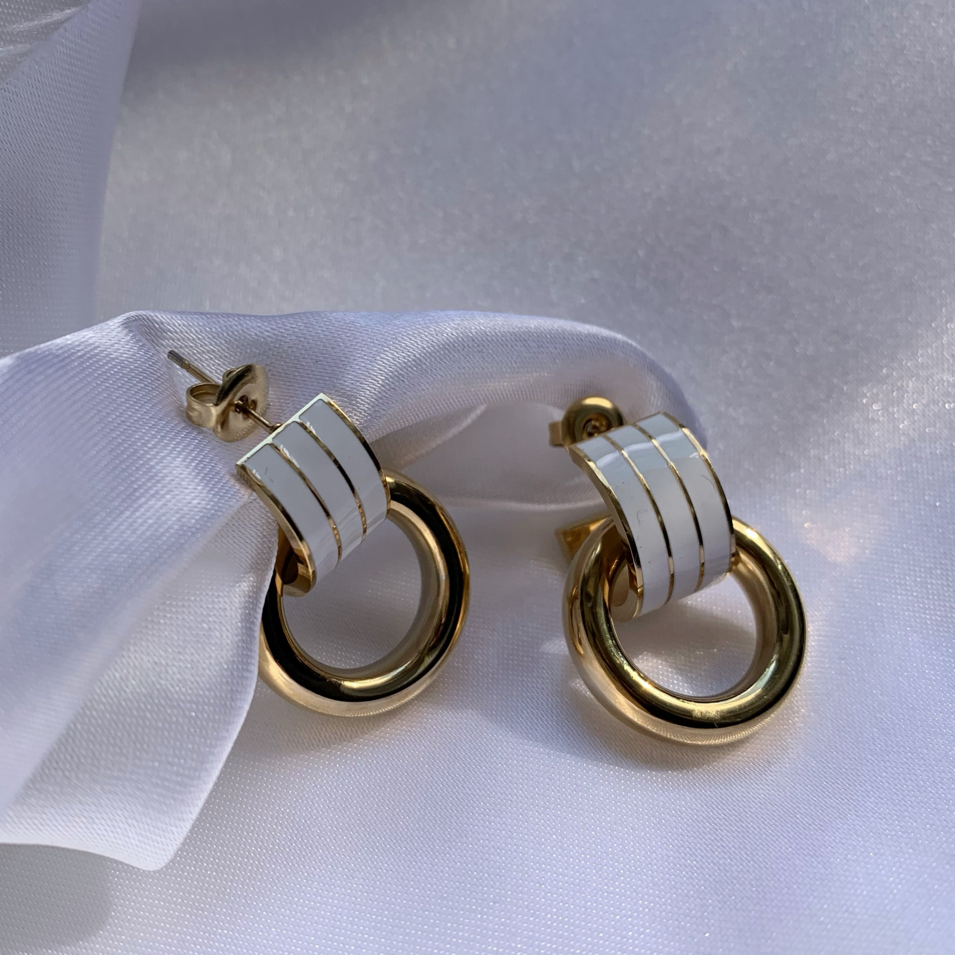 Orecchini doppi con parte superiore smaltata bianca, chiusura con farfallina.